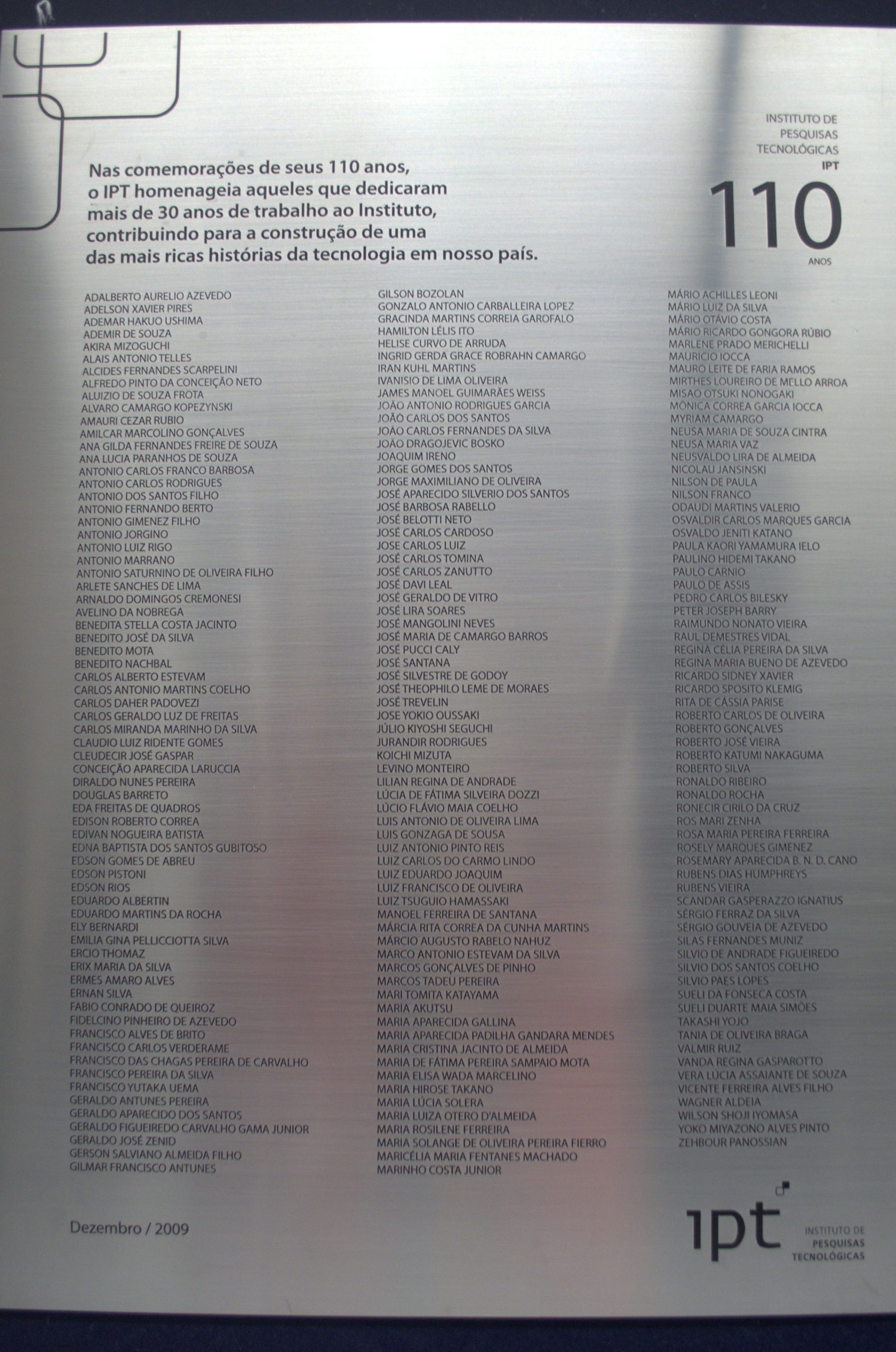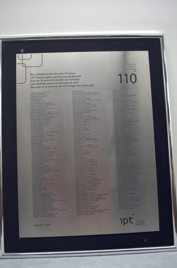 Documentos DSC_3636 Baixar DSC_3635 Baixar DSC_3636 DSC_3635 ApresentaçãoNúmero de registro01.020.0003.0001ConteúdoEm comemoração aos 110 anos do IPT, esta placa homenageia aqueles que dedicaram mais de três décadas de trabalho ao instituto, contribuindo para a construção de uma das mais ricas histórias da tecnologia em nosso país.GrupoMemória InstitucionalSubgrupoMemória da ciênciaSérieEscriturasSuporteObjeto TridimensionalGêneroIconográfico | TextualData2009DimensãoDimensão: 72 cm x 58 cm x 2 cm Metadados TipologiaTridimensionalTécnica de registroObjeto 3d. Técnicas variadasFormatoObjeto tridimensionalMaterialmetalIdiomaPortuguêsProcedênciaMemória Histórica IPT Conservação Estado de conservaçãoBomAcondicionamentoPapel glassine | Sem caixa Item anterior01.006.0206.0001 – Modem Próximo item01.020.0004.0001