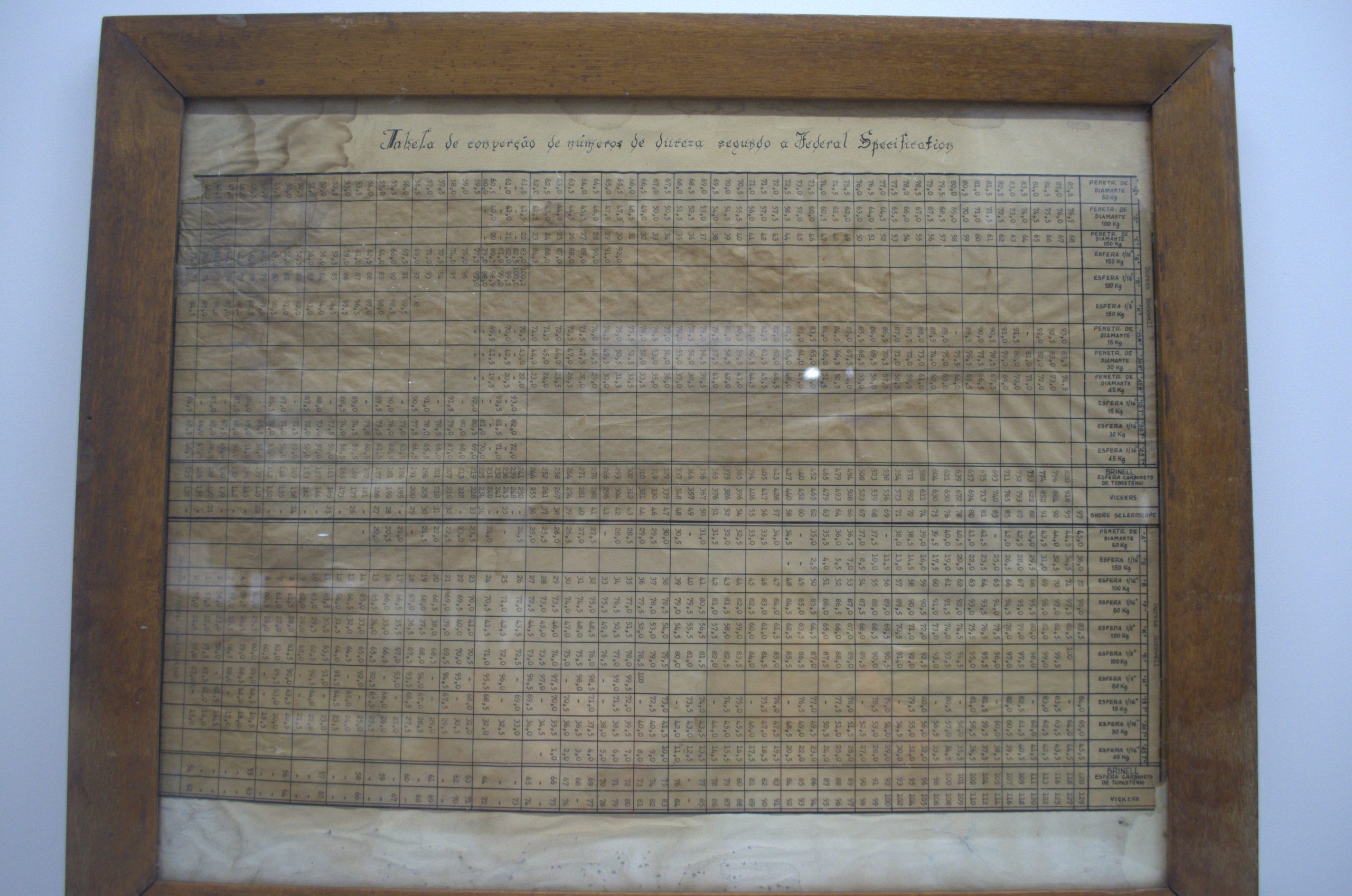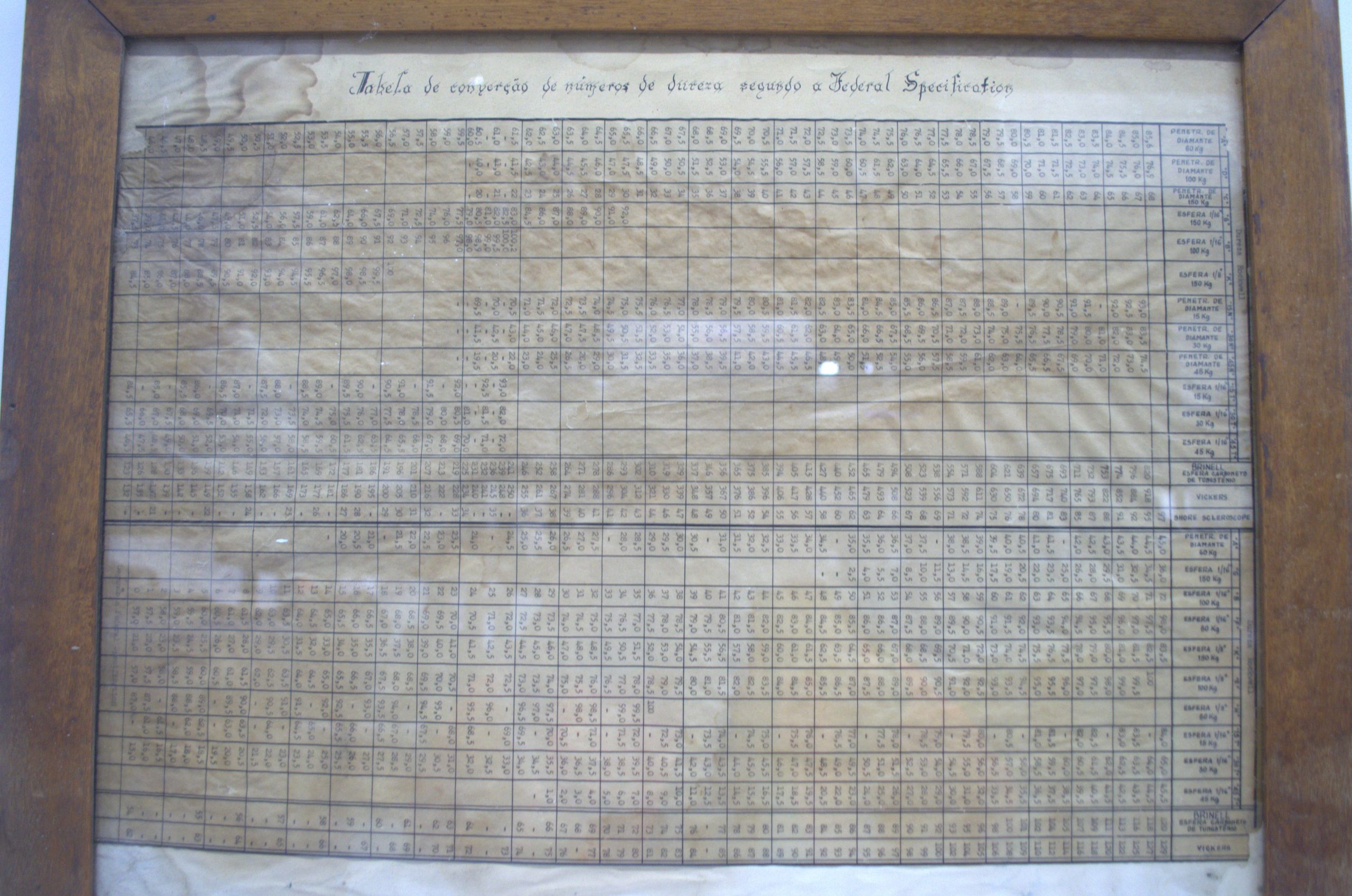 Uma antiga tabela de conversão de números de dureza segundo as especificações federais, utilizada para relacionar diferentes escalas de medição de dureza de materiais, como Brinell, Rockwell e Vickers. Esse tipo de tabela era comum em laboratórios e indústrias para facilitar a comparação entre resultados obtidos por métodos distintos de ensaio, garantindo padronização e precisão nas análises de metais e ligas.