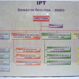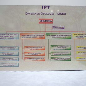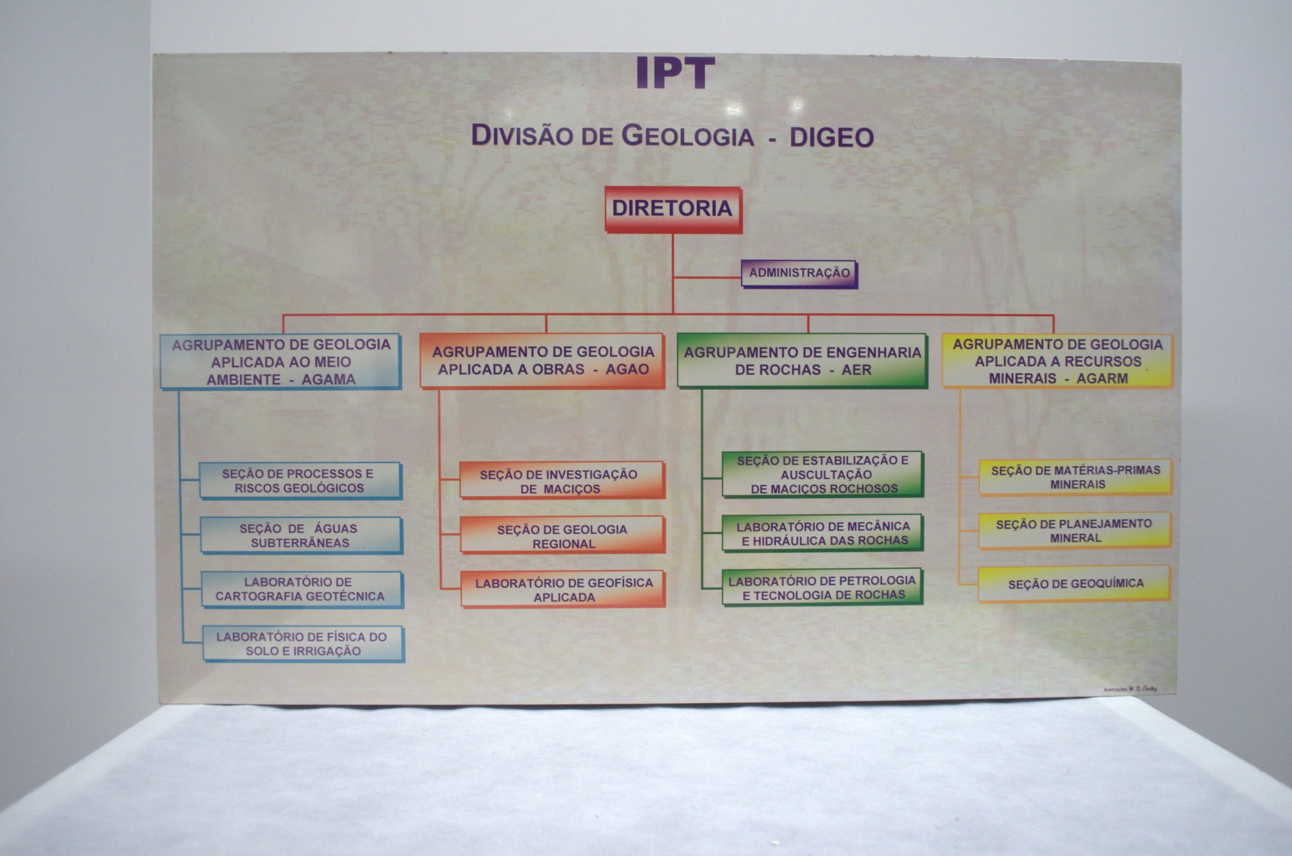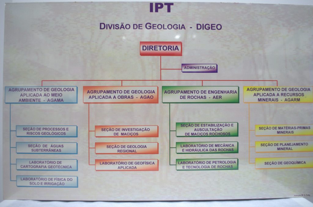 O organograma apresenta a estrutura da Divisão de Geologia (DIGEO) do IPT, organizada em quatro agrupamentos principais: Geologia Aplicada ao Meio Ambiente (AGAMA), Geologia Aplicada a Obras (AGAO), Engenharia de Rochas (AER) e Geologia Aplicada a Recursos Minerais (AGARM). Cada agrupamento reúne seções e laboratórios especializados, abrangendo áreas como riscos geológicos, águas subterrâneas, geofísica, mecânica e tecnologia de rochas, matérias-primas minerais, planejamento mineral e geoquímica, refletindo a atuação integrada em pesquisa, desenvolvimento e soluções técnicas em geologia.