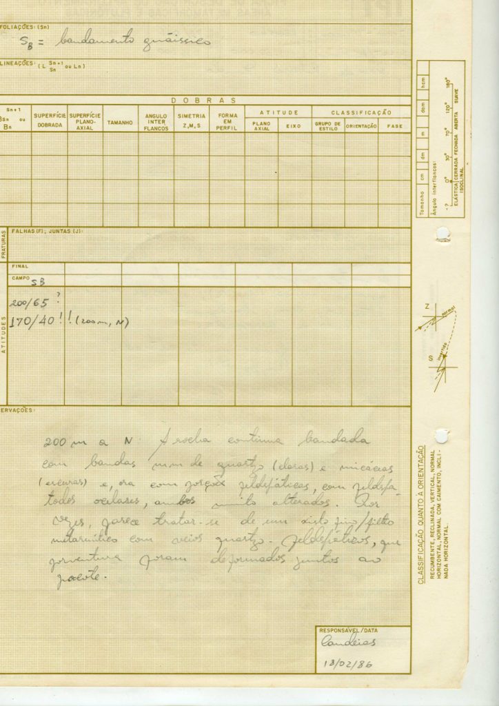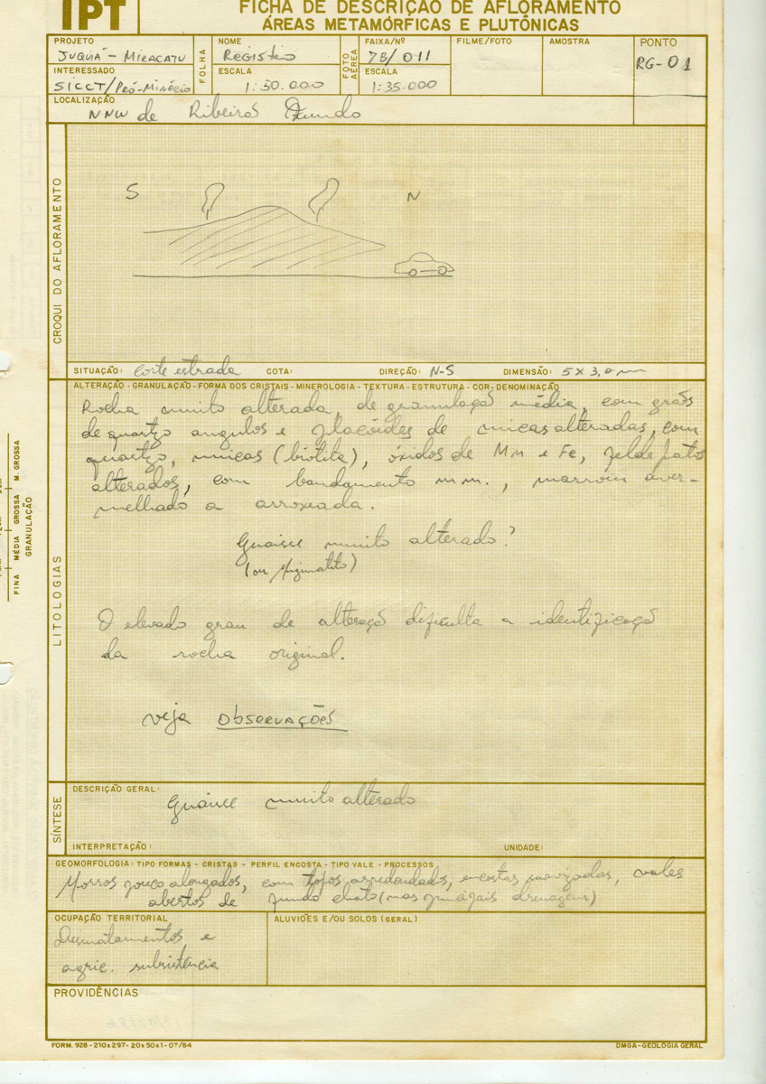IPT Ficha de descrição de afloramento; Áreas de rochas metamórficas e plutônicas. Projeto: Juquiá - Miracatu; Interessado: SICCT / Pró Minério; Folha/Nome: Registro; Escala: 1:50.000; Foto aérea/Faixa/Nº: 78/011; Escala: 1:35.000; Ponto: RG-01; Localização: NNW de Ribeirão Fundo