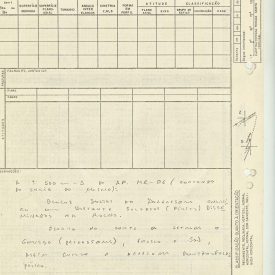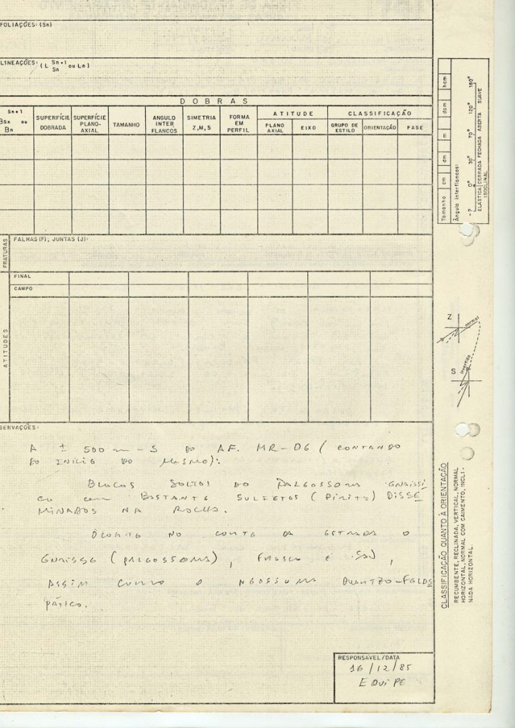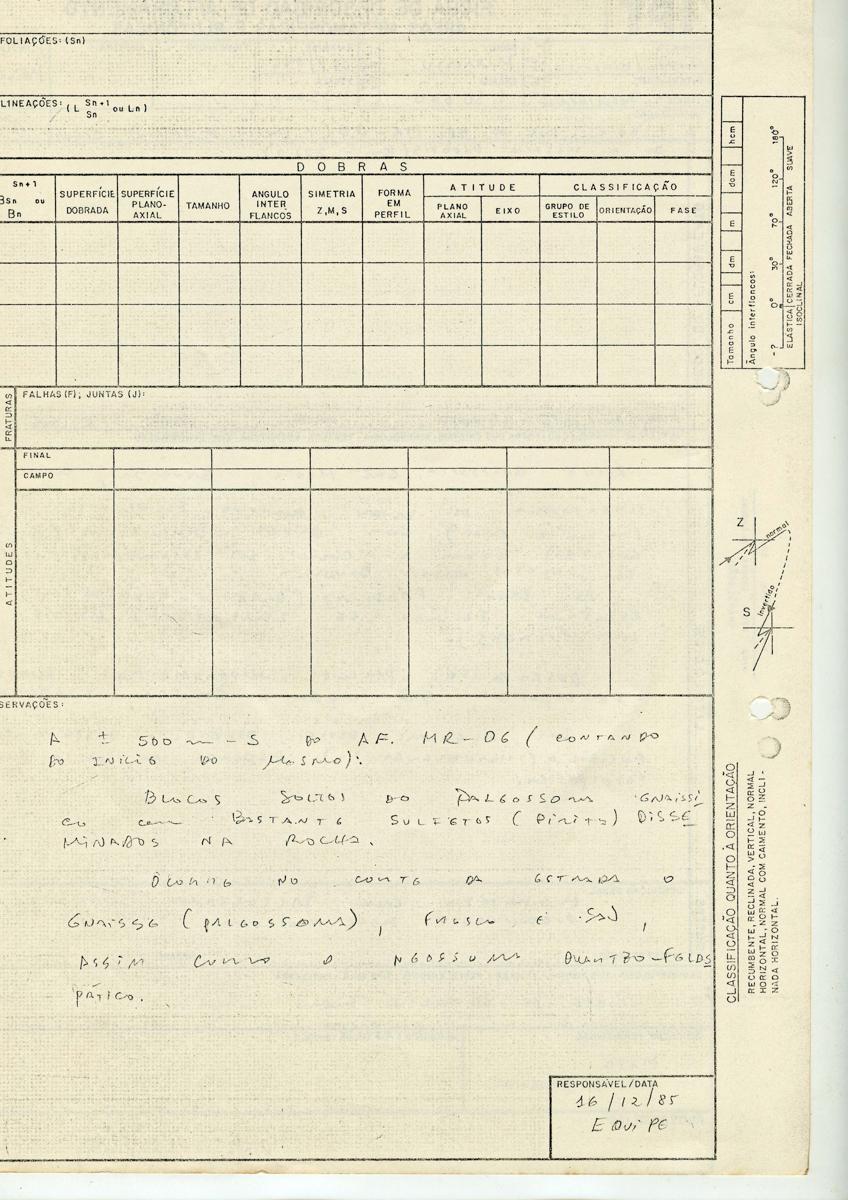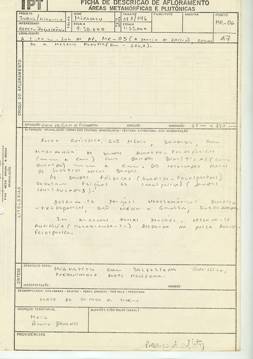 IPT Ficha de descrição de afloramento; Áreas de rochas metamórficas e plutônicas. Projeto: Juquiá / Miracatú; Interessado: SICCT / Pró Minério; Folha/Nome: Miracatú; Escala: 1:50.000; Foto aérea/Faixa/Nº: 08A/046; Escala: 1:35.000; Ponto: MR-06/A7; Localização: A + - 500 m - Sul do AF. MR - 05 (A partir do início), segundo a mesma rodovia (km 222.0).