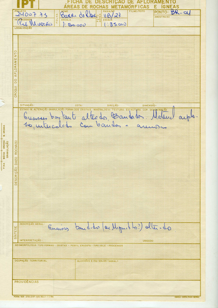 IPT Ficha de descrição de afloramento; Áreas de rochas metamórficas e ígneas. Projeto: 2400773; Interessado: Pró Minério; Folha/Nome: Barra do Ribeira; Escala: 1:50.000; Foto aérea/Faixa/Nº: 118/23; Escala: 1:35.000; Ponto: BR-04