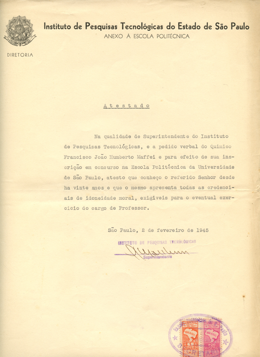 atestado solicitado por Maffei ao IPT informando que o mesmo possui as credenciais para o concurso da Escola Politécnica
