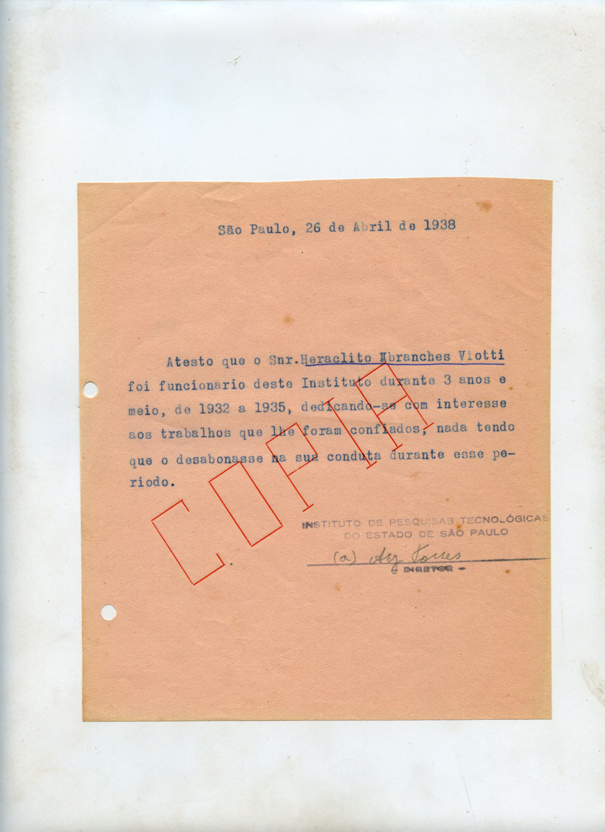 O Diretor Ary Torres atesta que o Snr. Heraclito Abranches Viotti foi funcionário do Instituto de Pesquisas Tecnológicas do Estado de São Paulo durante 3 anos e meio, de 1932 a 1935, dedicando-se com interesse aos trabalhos que lhe foram confiados, nada tendo que o desabonasse na sua conduta durante esse período