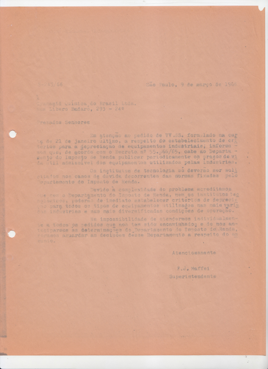 Carta S-243/66 de F.J. Maffei (Superintendente) a Cyanamid Química do Brasil Ltda. relativo ao estabelecimento de critério para a depreciação de equipamentos industriais, estando a cargo do Departamento de Imposto de Renda publicar periodicamente os prazos de vida útil dos equipamentos usado na industria.