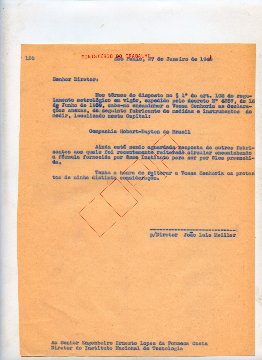 Carta do Diretor João Luis Meiller ao Senhor Engenheiro Ernesto Lopes da Fonseca Costa, Diretor do Instituto Nacional de Tecnologia, onde é dito que o encaminham as declarações anexas do seguinte fabricante de medidas e instrumentos de medir: Companhia Hobart-Dayton do Brasil