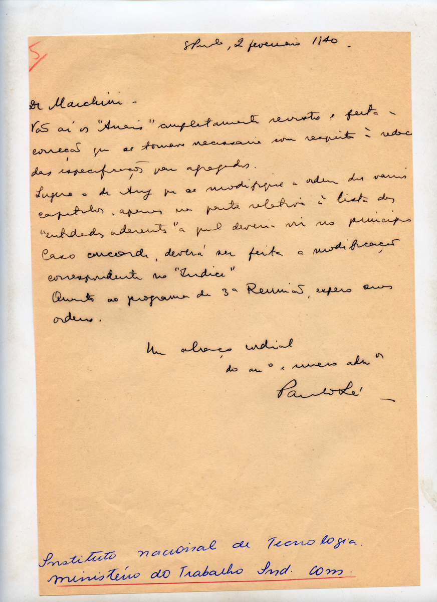 Documentos 01.001.0112.0026 Baixar ApresentaçãoNúmero de registro01.001.0112.0026 | 01.001.0112.0027ConteúdoCarta de Paulo Sá, do INT, a Marchini, do IPT, em que indica o envio dos "Anais" completamente revistos e feitas as correções que se tornaram necessáriasGrupoMemória InstitucionalSubgrupoMemória da ciênciaSérieDossiêsSuportePapelGêneroTextualData[02/02/1940] - [06/03/1940]Nível de descriçãoConjunto Metadados TipologiaCartaTécnica de registroManuscritoFormatoFolhaQuantidade de documentosA4, 2 folhasNúmero de Itens do conjunto002MaterialpapelIdiomaPortuguêsProcedênciaMemória Histórica IPT Conservação Estado de conservaçãoBomAcondicionamentoCaixa Filifold | Papel glassine Itens deste conjunto Mídias dos conjuntosConjunto de itens Ver todos os 2 itens relacionados Item anteriorCarta Próximo itemTelegrama Outros itens deste Grupo 01.020.0024.0001 01.020.0023.0001 01.020.0019.0001 01.020.0016.0001