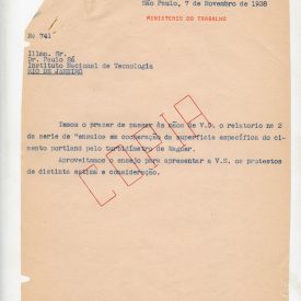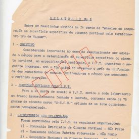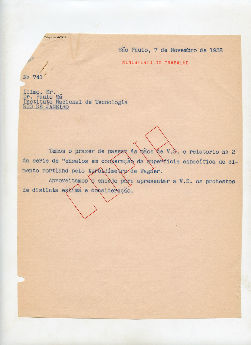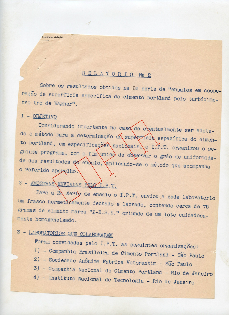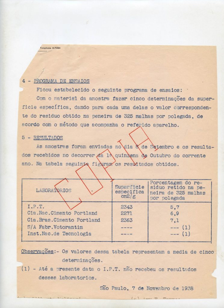 Documentos 01.001.0112.0104_28129 Baixar 01.001.0112.0104_28229 Baixar 01.001.0112.0104_28329 Baixar 01.001.0112.0104_28129 01.001.0112.0104_28229 01.001.0112.0104_28329 ApresentaçãoNúmero de registro01.001.0112.0104ConteúdoCarta enviada a Paulo Sá, por Ary F Torres, onde diz ter o prazer de passar às mãos dele, o relatório nº 2 da série de "ensaios em cooperação da superfície específica do cimento Portland pelo turbidímetro de Wagner"GrupoMemória InstitucionalSubgrupoMemória da ciênciaSérieDossiêsSuportePapelGêneroTextualData[07/11/1938]Nível de descriçãoIndividual Metadados TipologiaCartaTécnica de registroDatilografiaFormatoFolhaQuantidade de documentosA4, 3 folhasNúmero de Itens do conjunto001MaterialpapelIdiomaPortuguêsProcedênciaMemória Histórica IPT Conservação Estado de conservaçãoBomOutros aspectos físicosApresenta marcas de oxidaçãoAcondicionamentoCaixa Filifold | Papel glassine Item anteriorCarta Próximo itemCarta