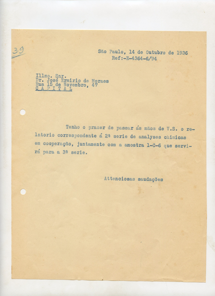 Comunicados do IPT relativos ao envio do relatório correspondente à "2ª série de analyses chimicas em cooperação", juntamente com a amostra 1-C-6 que servirá para a 3ª série; Comunicado sobre um novo regulamento, indicando que os ensaios deverão ser pagos no ato da entrega dos certificados.