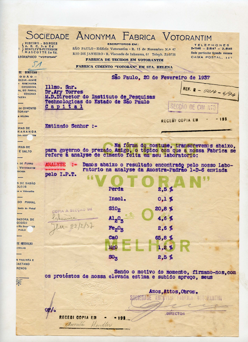 Resultado encontrado pelo Laboratório da Fabrica Votorantim na Analyse da Amostra-Padrão 1-D-6, enviada pelo IPT; Comunicado do IPT relativos ao envio do relatório correspondente à "4ª série de Analyses chimicas em cooperação" de cimento Portland, juntamente com a amostra 1E 1F, que constituirão material para as 5ª e 6ª séries; Envio de amostras e solicitações de análises