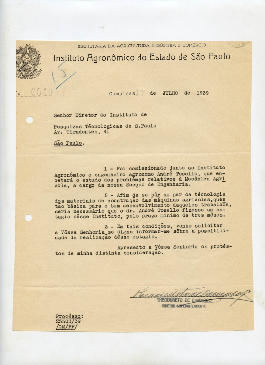 Solicitação de que, a fim de se pôr a par da tecnologia dos materiais de construção de máquinas agrícolas, seria necessário que o dr. André Tosello fizesse um estágio no IPT, pelo prazo mínimo de três meses; Em resposta, a solicitação é aprovada e é apresentado o programa pelo qual ele cumprirá esse estágio