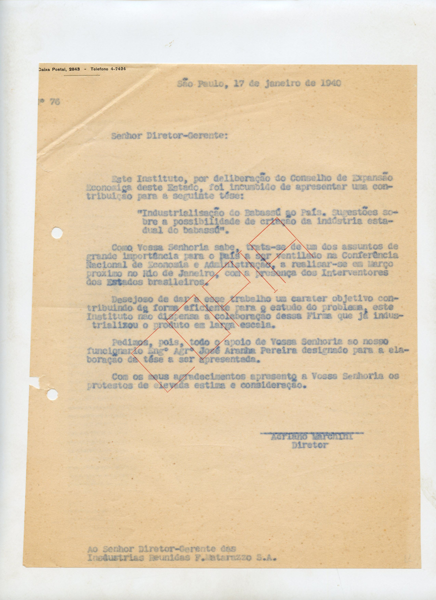 Documentos 01.001.0112.0296 Baixar ApresentaçãoNúmero de registro01.001.0112.0296ConteúdoApresentação, de Adriano Marchini, de tese: "Industrialização do Babassú ao País. Sugestões sobre a possibilidade de criação da indústria estadual do babassú"GrupoMemória InstitucionalSubgrupoMemória da ciênciaSérieDossiêsSuportePapelGêneroTextualData[17/01/1940]Nível de descriçãoIndividual Metadados TipologiaCartaTécnica de registroDatilografiaFormatoFolhaQuantidade de documentosA4, 1 folhaNúmero de Itens do conjunto001MaterialpapelIdiomaPortuguêsProcedênciaMemória Histórica IPT Conservação Estado de conservaçãoBomOutros aspectos físicosApresenta amassamentoAcondicionamentoCaixa Filifold | Papel glassine Item anteriorCarta Próximo itemCarta