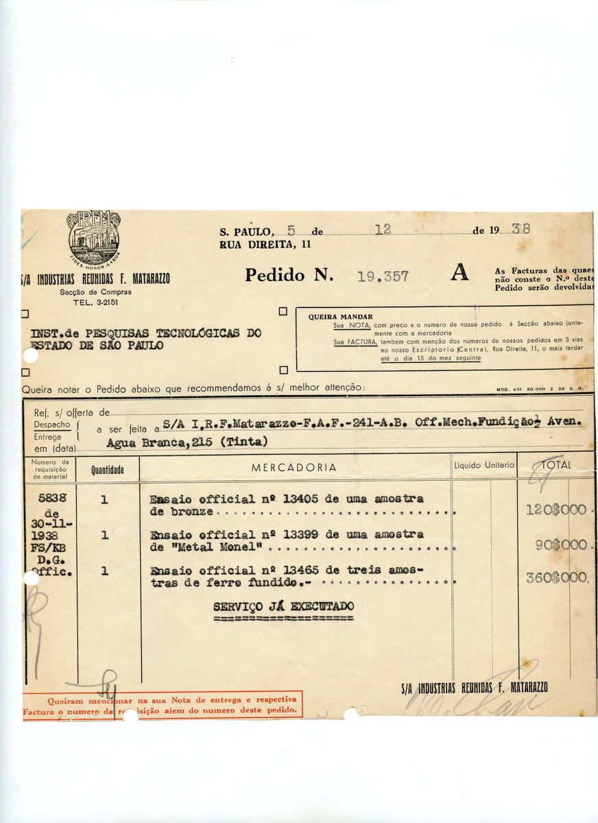 Envio das Indústrias Reunidas F. Matarazzo de amostras para análises do IPT de: bronze, Metal Monel, ferro fundido, material p/ fabricação de Louças, petróleo crú, cavacos de ferro gusa typo A e B, cavacos de ferro fundido, caixa de pesos de 50 a 0.05g, caolin, cavacos de bronze, óleo mineral bruto ou crú, ácido tratado com soda, arsênio, Extracto de tabaco, Carvão Nacional, Kaolim crú A1 e A3, Argilla crúa C1 e C2, enxofre em pedra e em pó, água, Soda Caustica, farelo de café e de pedregulhos
