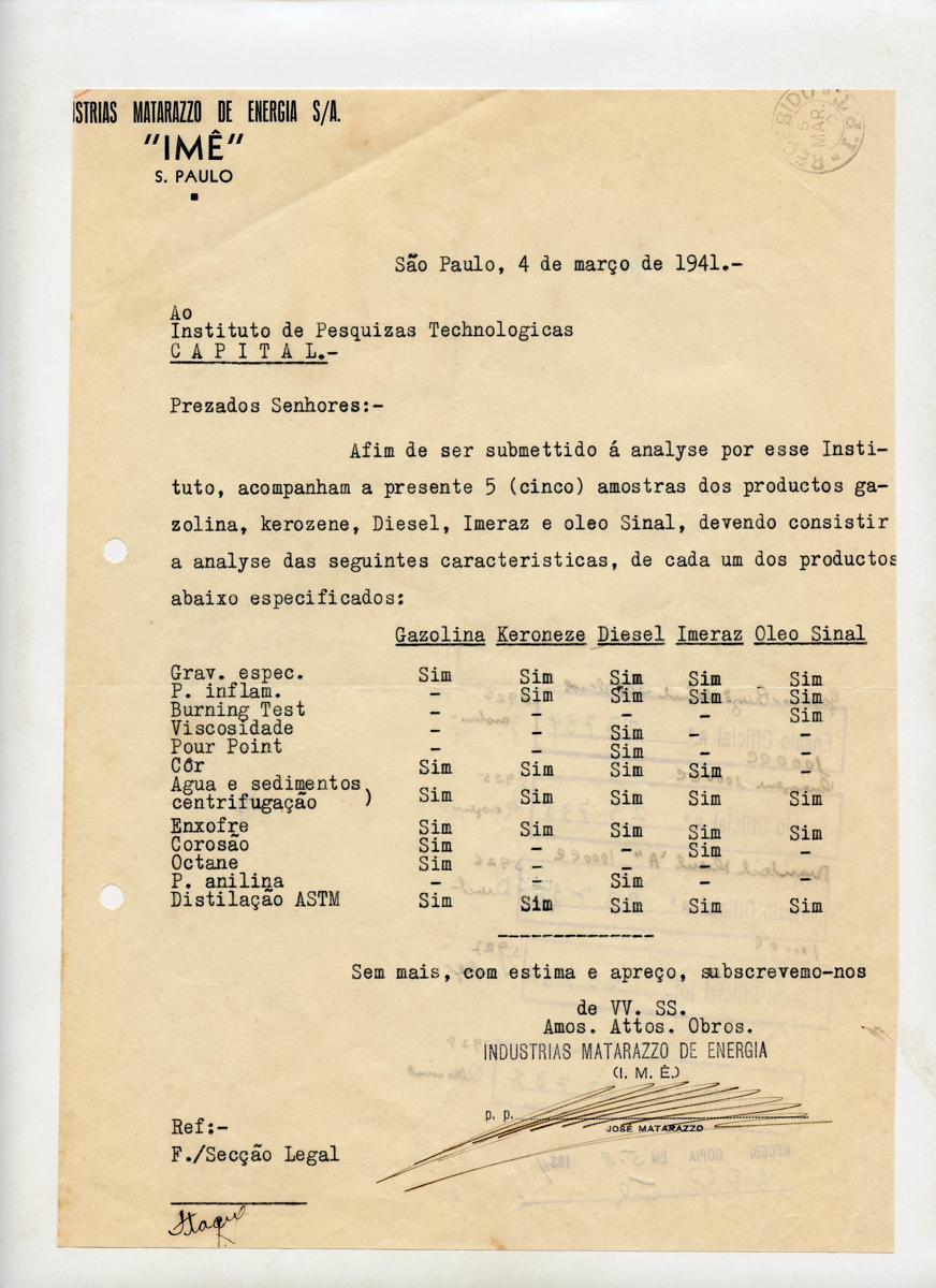 Envio das Indústrias Reunidas F. Matarazzo de amostras para análises do IPT de: 5 (cinco) amostras dos productos gasolina, kerozene, Diesel, Imeraz e oleo Sinal; amostras de pedra calcárea, DD "Broad" e EE "Broad", pedras que se destina à fabricação de cimento