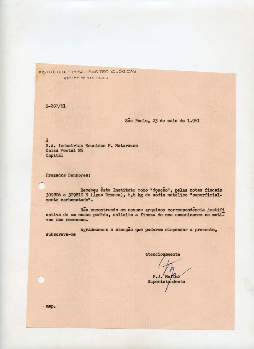 Documentos 01.001.0112.0584 Baixar ApresentaçãoNúmero de registro01.001.0112.0584 | 01.001.0112.0585 | 01.001.0112.0586 | 01.001.0112.0587 | 01.001.0112.0588 | 01.001.0112.0589 | 01.001.0112.0590 | 01.001.0112.0591 | 01.001.0112.0592 | 01.001.0112.0593 | 01.001.0112.0594 | 01.001.0112.0595ConteúdoInformações sobre sódio metálico "superficialmente carbonatado", ensaio de corrosão, tubo de aço inoxidável e produto denominado "MATVISCA"GrupoMemória InstitucionalSubgrupoMemória da ciênciaSérieDossiêsSuportePapelGêneroTextualData[__/__/1961]Nível de descriçãoConjunto Metadados TipologiaCartaTécnica de registroDatilografiaFormatoFolhaQuantidade de documentosA4, 12 folhasNúmero de Itens do conjunto012MaterialpapelIdiomaPortuguêsProcedênciaMemória Histórica IPT Conservação Estado de conservaçãoBomOutros aspectos físicosApresenta dobras e manchasAcondicionamentoCaixa Filifold | Papel glassine Itens deste conjunto Mídias dos conjuntosConjunto de itens Ver todos os 12 itens relacionados Item anteriorRecibo de entrega Próximo itemCarta Outros itens deste Grupo 01.020.0024.0001 01.020.0023.0001 01.020.0019.0001 01.020.0016.0001