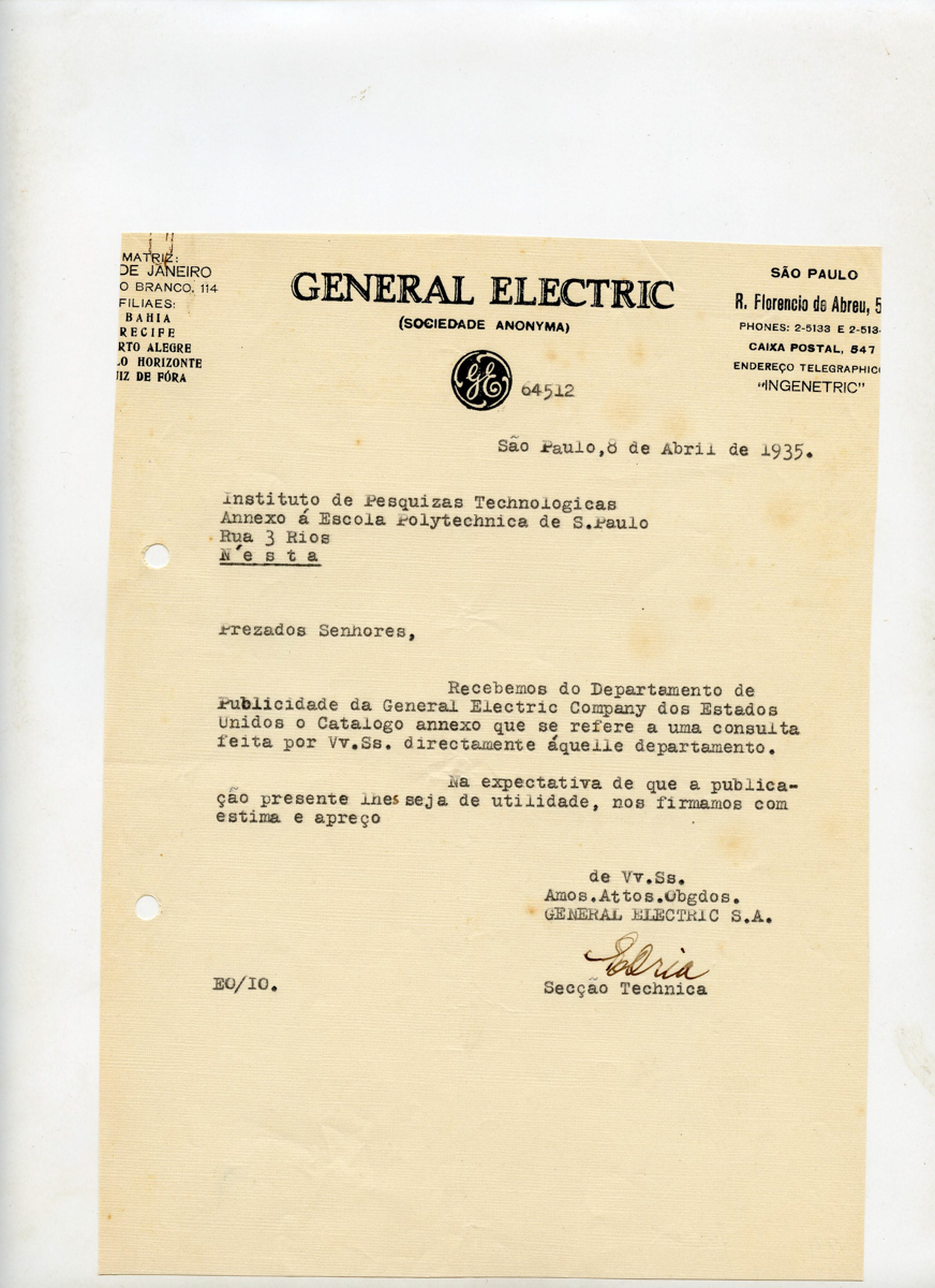 Correspondências entre a empresa General Electric e o IPT, onde são tratados: orçamentos de aparelho receptor de T.S. F, de pendula electrica de precisão, de systema de relojoaria, de diaspasão de vibrações mantidas electricamente, de chronographo registrador de três pennas ao menos, de instalação electrica necessária para o funcionamento de todos esses aparelhos, de instalação para medidas precisas de tempo
