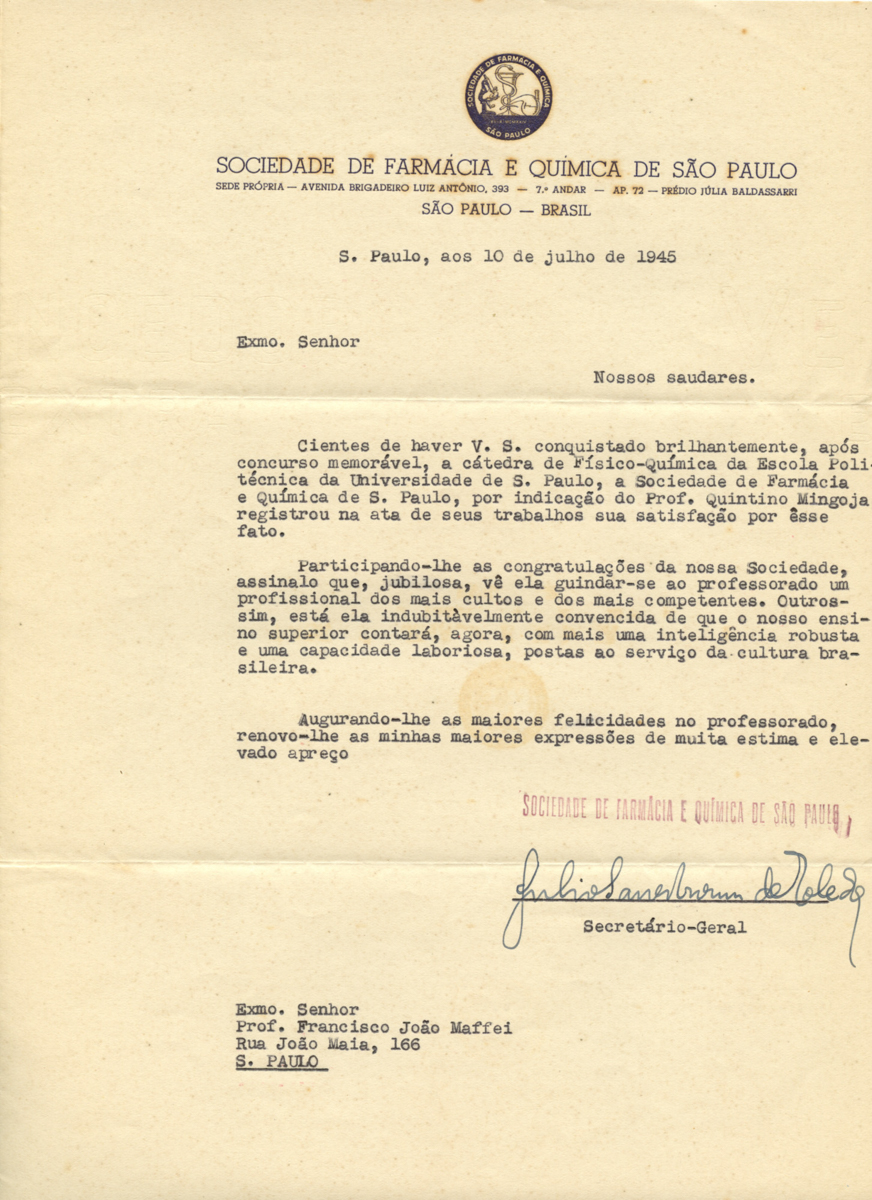 carta de congratulação da Sociedade de Farmácia e Química de São Paulo pela conquista da cadeira nº27