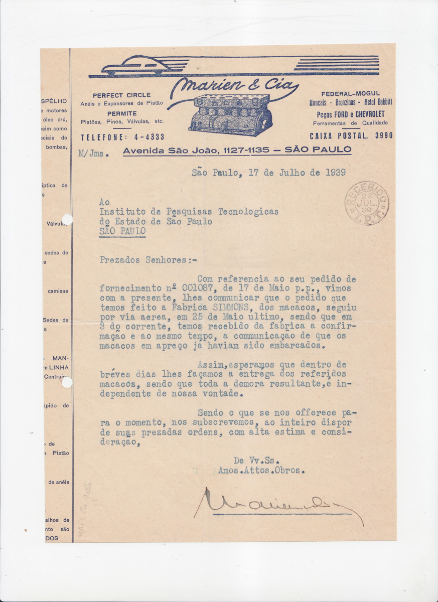 Documentos 01.001.0115.0029 Baixar ApresentaçãoNúmero de registro01.001.0115.0029ConteúdoFuncional; Marien & Cia.; envio de aparelhosGrupoMemória InstitucionalSubgrupoMemória da ciênciaSérieDossiêsSuportePapelGêneroTextualData[17/07/1939]Nível de descriçãoIndividual Metadados TipologiaCartaTécnica de registroImpressão | ManuscritoFormatoFolhaQuantidade de documentosA4, 1 folhaNúmero de Itens do conjunto001Materialpapel de cartaIdiomaPortuguêsProcedênciaMemória Histórica IPT Conservação Estado de conservaçãoBomOutros aspectos físicosApresenta dobrasAcondicionamentoCaixa Filifold | Papel glassine Item anteriorCarta Próximo itemCarta