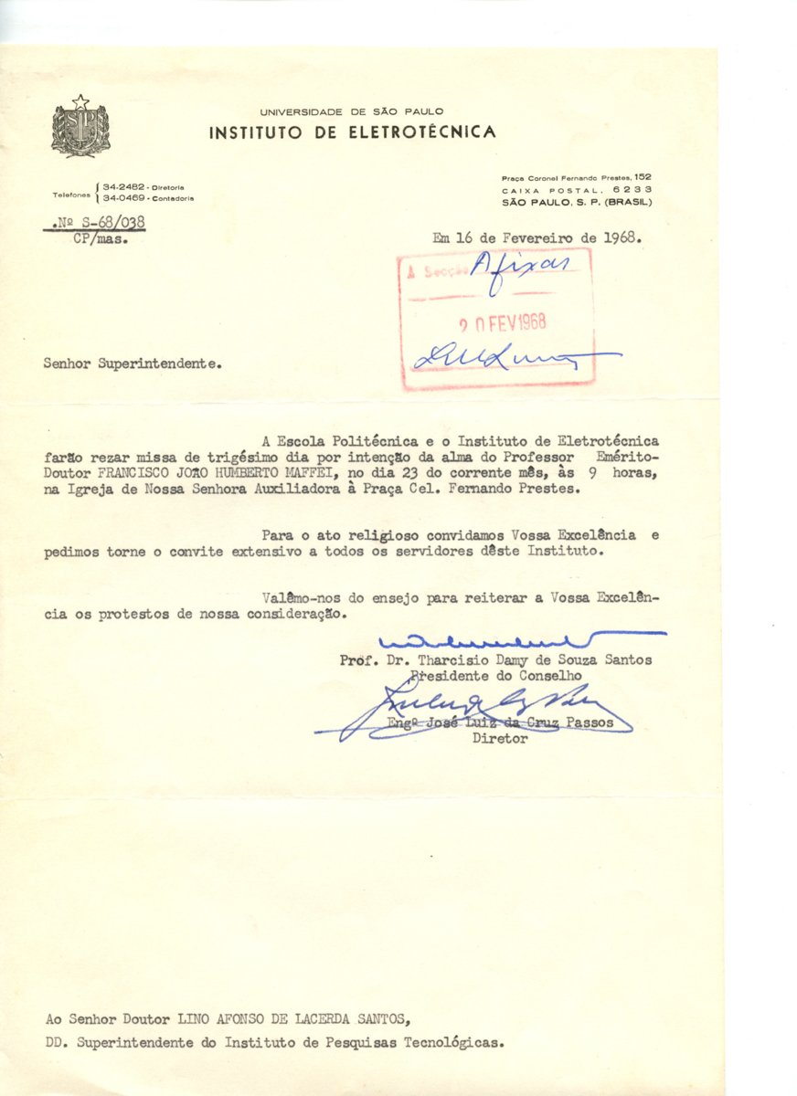 Documentos 01.001.0002.0073 Baixar ApresentaçãoNúmero de registro01.001.0002.0073ConteúdoCarta do Instituto de Eletrotécnica comunicando e convidando ao superintendente do IPT - e aos demais funcionários - que tal instituto e a Escola Politécnica farão rezar uma missa pelo 30º dia de falecimento de Francisco Maffei.GrupoMemória InstitucionalSubgrupoAcervo Francisco MaffeiSuportePapelGêneroTextualData__/__/1968Nível de descriçãoIndividual Metadados TipologiaCartaTécnica de registroDatilografiaFormatoFolhaQuantidade de documentos1 documento, 1 folhaNúmero de Itens do conjunto001MaterialpapelIdiomaPortuguêsProcedênciaDiretoria de Operações Conservação Estado de conservaçãoBomAcondicionamentoCaixa Filifold | Caixa poliondas | Papel glassine Item anteriorComunicado/Carta Próximo itemCarta