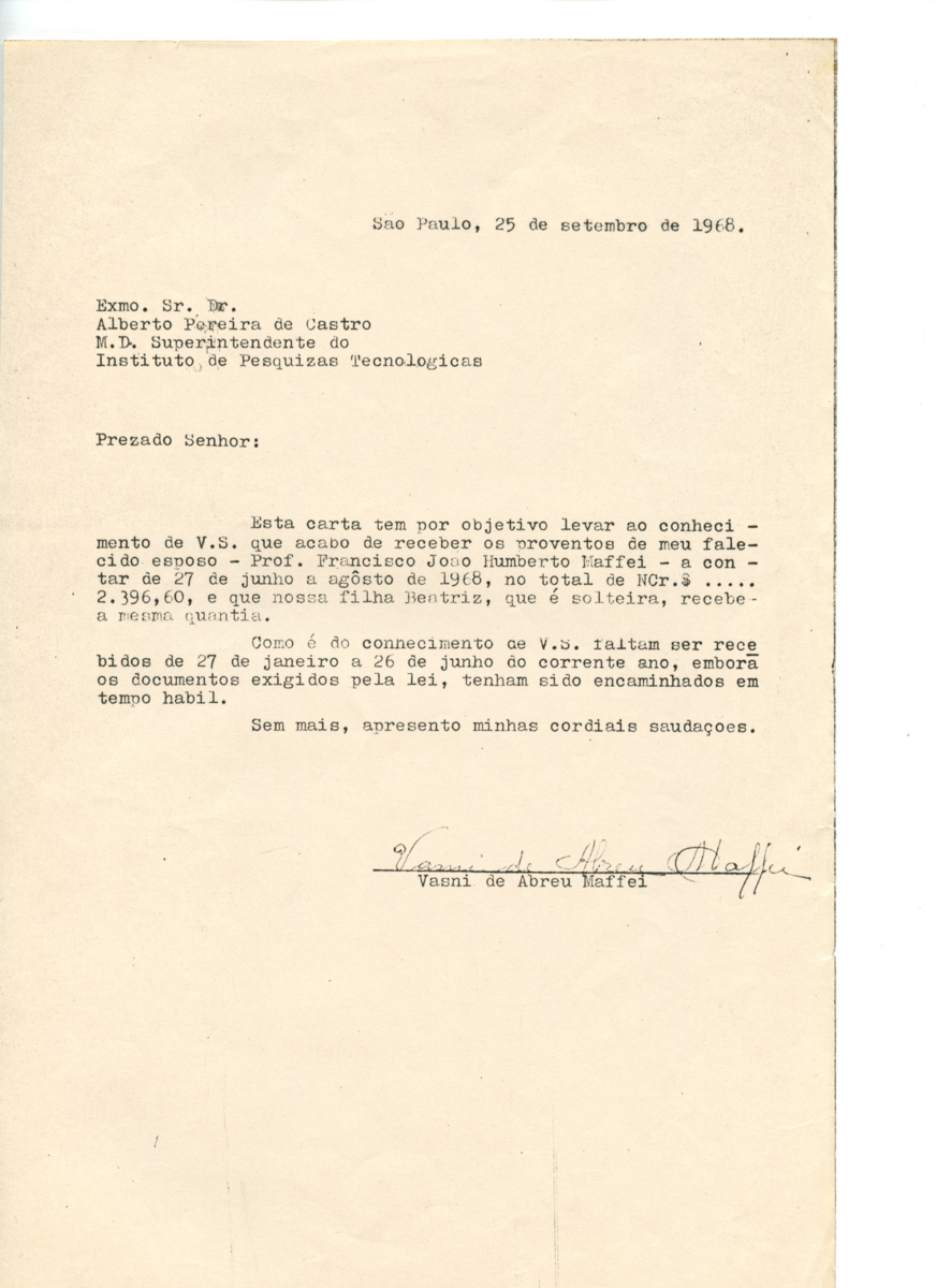 Documentos 01.001.0002.0075 Baixar ApresentaçãoNúmero de registro01.001.0002.0075 | 01.001.0002.0076Conteúdocarta de Vasni de Abreu Maffei, viúva de Francisco Maffei, comunicando o o atraso do pagamento. Em anexo a carta, cópia do contracheque do Instituto de Previdência do Estado de São PauloGrupoMemória InstitucionalSubgrupoAcervo Francisco MaffeiSuportePapelGêneroTextualData__/__/1968Nível de descriçãoIndividual Metadados TipologiaCartaTécnica de registroDatilografiaFormatoFolhetoQuantidade de documentos2 documentos, 2 folhasNúmero de Itens do conjunto002MaterialpapelIdiomaPortuguêsProcedênciaDiretoria de Operações Conservação Estado de conservaçãoBomAcondicionamentoCaixa Filifold | Caixa poliondas | Papel glassine Itens deste conjunto Mídias dos conjuntosConjunto de itens Ver todos os 2 itens relacionados Item anteriorCarta Próximo itemRevista de circulação interna Outros itens deste Grupo 01.020.0024.0001 01.020.0023.0001 01.020.0019.0001 01.020.0016.0001