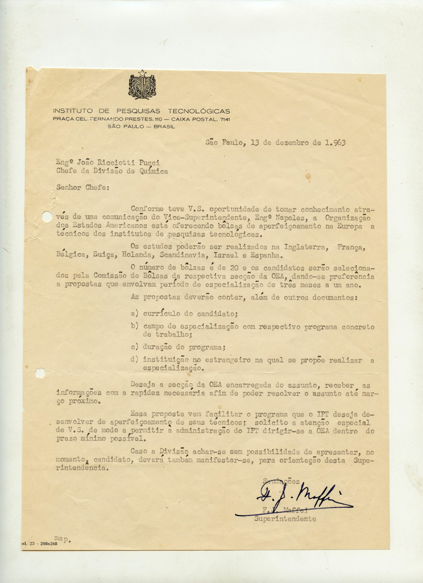 Documentos 01.001.0017.0168 Baixar ApresentaçãoNúmero de registro01.001.0017.0168ConteúdoCorrespondência de F.J. Maffei a João Ricciotti Pucci, sobre a Organização dos Estados Americanos estar oferecendo bolsas de aperfeiçoamento na Europa a técnicos dos institutos de pesquisas tecnológicasGrupoGestão InstitucionalSubgrupoRelações InstitucionaisSérieCartas, correspondências, bilhetes, ofícios e memorandosSuportePapelGêneroTextualData__/__/1963Nível de descriçãoIndividual Metadados TipologiaCartaTécnica de registroDatilografiaFormatoFolhaQuantidade de documentos1 documento, 1 folhaNúmero de Itens do conjunto001MaterialpapelIdiomaPortuguêsProcedênciaDAIT - Departamento de Acervo e Informação Tecnológica Conservação Estado de conservaçãoBomAcondicionamentoCaixa Filifold | Caixa poliondas | Papel glassine Item anteriorHistórico Escolar Próximo itemOfício