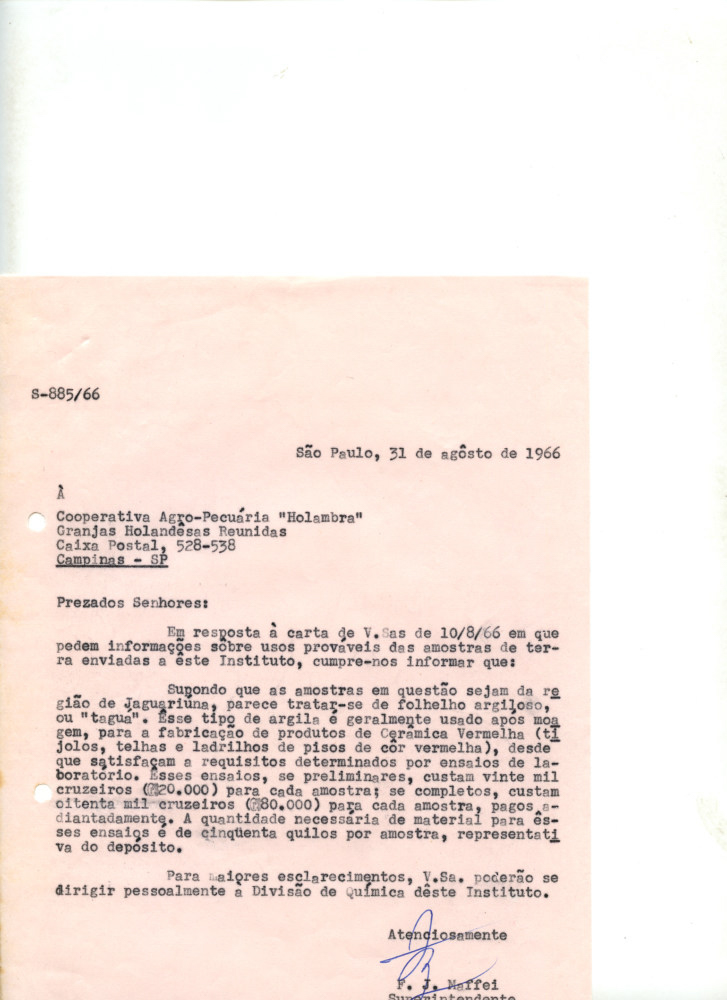 Documentos 01.001.0031.0057 Baixar ApresentaçãoNúmero de registro01.001.0031.0057ConteúdoCorrespondência do IPT com a Cooperativa agro pecuária HolambraGrupoGestão InstitucionalSubgrupoRelações InstitucionaisSérieCartas, correspondências, bilhetes, ofícios e memorandosSuportePapelGêneroTextualData__/__/1966Nível de descriçãoIndividual Metadados TipologiaCartaTécnica de registroDatilografiaFormatoFolhaQuantidade de documentos1 documento, 1 folhaNúmero de Itens do conjunto001MaterialpapelIdiomaPortuguêsProcedênciaDAIT - Departamento de Acervo e Informação Tecnológica Conservação Estado de conservaçãoBomAcondicionamentoCaixa Filifold | Caixa poliondas | Papel glassine Item anteriorCarta Próximo itemCarta