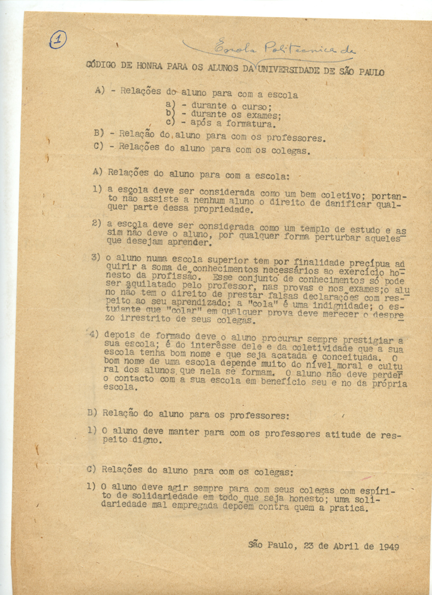 Documentos 01.001.0028.0019 Baixar ApresentaçãoNúmero de registro01.001.0028.0019ConteúdoCódigo de honra para os alunos da Escola Politécnica da Universidade de São PauloGrupoBibliotecaSuportePapelGêneroTextualData__/__/1949Nível de descriçãoIndividual Metadados TipologiaCódigo de comportamentoTécnica de registroDatilografiaFormatoFolhaQuantidade de documentos1 documento, 1 folhaNúmero de Itens do conjunto001MaterialpapelIdiomaPortuguêsProcedênciaCTMM - Centro de Tecnologia em Metalurgia e Materiais Conservação Estado de conservaçãoBomAcondicionamentoCaixa Filifold | Caixa poliondas | Papel glassine Item anteriorCarta Próximo itemCarta convite