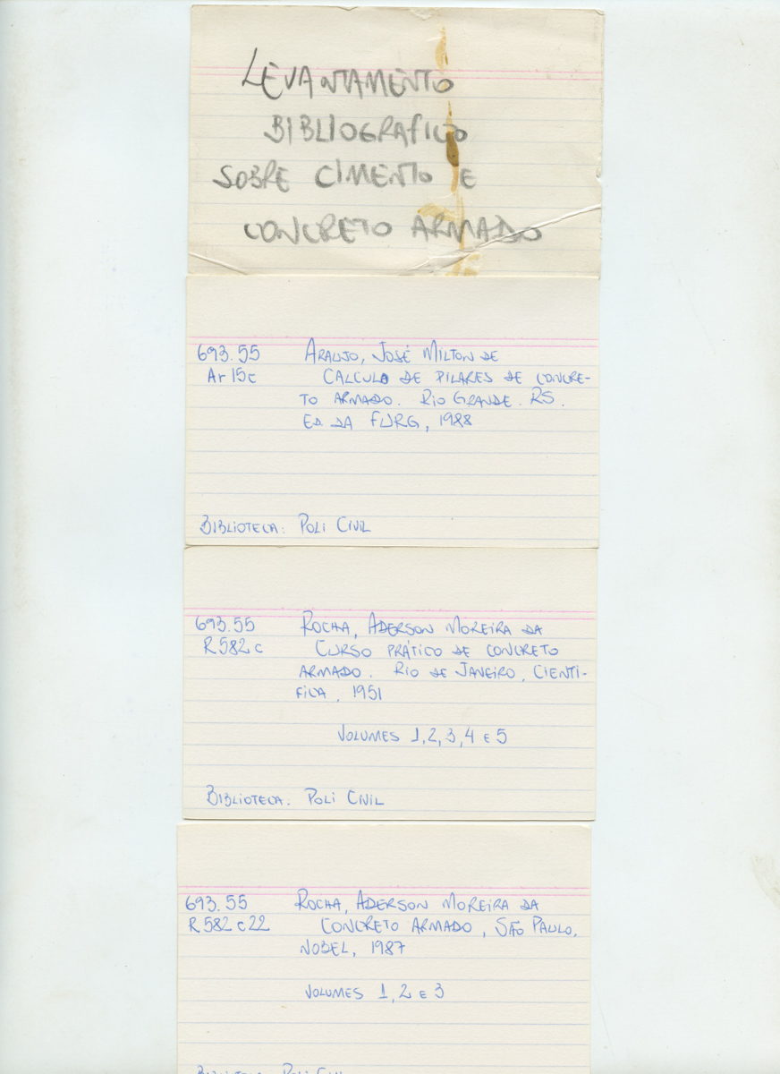 Fichas de levantamento bibliográfico sobre cimento e concreto armado; Folheto do Simpósio "Tecnologia Humanismo e o futuro em homenagem aos 80 anos do Prof. Milton Vargas";Livro IPT de 1990 (único exemplar); Livro "A cidade Iluminada: Tecnologia e política a serviço da Light no início do Século" de 1989; Fotografias da Inauguração do laboratório de fogo em 03/02/1994; Trabalho de conclusão de curso sobre os 95 anos do IPT, realizado por um grupo de relações públicas da FIAM (parcialmente digitalizado).