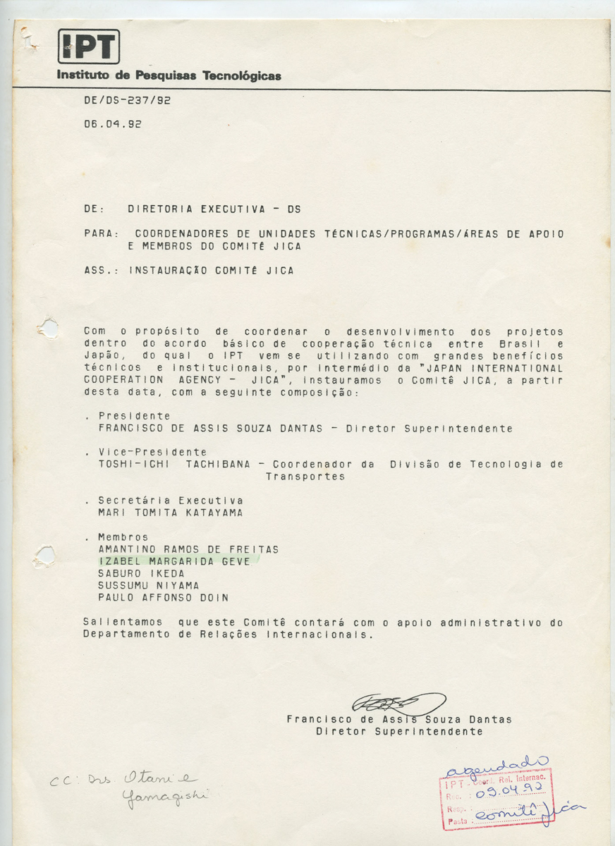 Correspondências do comitê da JICA (fax, cartas, memorandos, minutas, circular), atas de reuniões, relatórios de projetos e atividades desenvolvidas pelo comitê. Presidente/Diretor Superintendente: Fracisco de Assis Souza Dantas; Vice-Presidente/Coordenador da Divisão de Tecnologia de Transportes: Toshi-Ichi Tachibana; Secretária Executiva: Mari Tomita Katayama; Membros: Amantino Ramos de Freitas, Izabel Margarida Geve, Saburo Ikeda, Sussumo Niyama e Paulo Affonso Doin; Instruções normativas quanto a de recepção pelo IPT de um especialista técnico, enviado através da JICA, que não se encontrava vinculada a nenhum projeto custeado pela JICA; Roteiro da palestra para o simpósio Cooperação Técnica: um caminho para a harmonia da humanidade, palestra "Melhorias obtidas através de projetos para o desenvolvimento de tecnologias industriais e temas para futuras considerações"