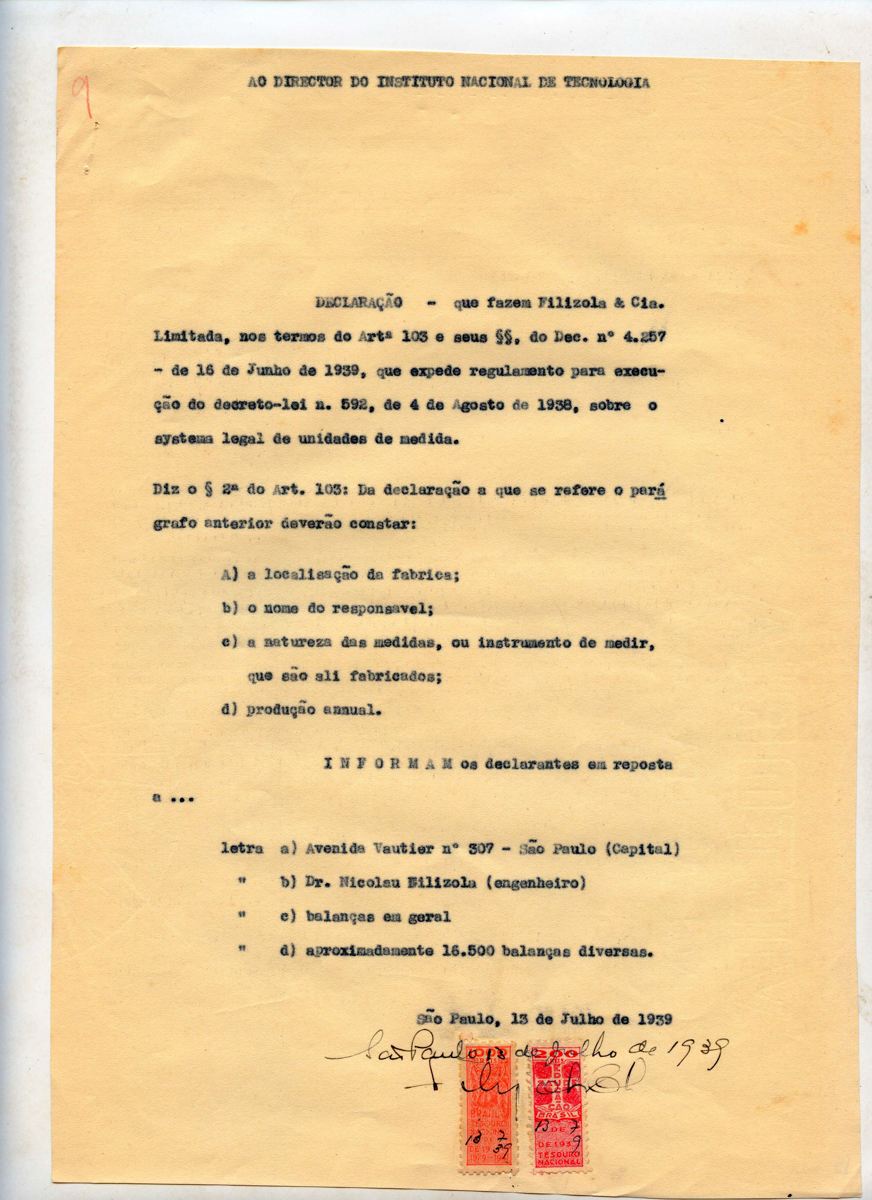 Documentos 01.001.0112.0013 Baixar ApresentaçãoNúmero de registro01.001.0112.0013ConteúdoO chefe da secção de Metrologia do instituto de Pesquisas Technológias de S. Paulo informa que fez uma visita à fábrica da forma Filizola & Cia. Ltda, na presença de um responsável, para uma inspeção nos termos do Regulamento MetrológicoGrupoMemória InstitucionalSubgrupoMemória da ciênciaSérieDossiêsSuportePapelGêneroTextualData[26/07/1939]Nível de descriçãoIndividual Metadados TipologiaInformeTécnica de registroDatilografiaFormatoFolhaQuantidade de documentosA4, 1 folhaNúmero de Itens do conjunto001MaterialpapelIdiomaPortuguêsProcedênciaMemória Histórica IPT Conservação Estado de conservaçãoBomOutros aspectos físicosApresenta pequenos rasgos, e furos de grampo e amassamentoAcondicionamentoCaixa Filifold | Papel glassine Item anteriorDeclaração Próximo itemCarta