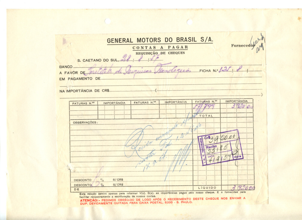 Documentos 01.001.0013.0285 Baixar ApresentaçãoNúmero de registro01.001.0013.0285 | 01.001.0013.0286 | 01.001.0013.0287ConteúdoMemorando de cheque enviado da General Motors ao IPTGrupoGestão Orçamentária e FinanceiraSubgrupoExecução orçamentária e financeiraSérieCertificados, recibos e manuaisSuportePapelGêneroTextualData__/__/1957Nível de descriçãoConjunto Metadados TipologiaMemorando de chequeTécnica de registroImpressão | ManuscritoFormatoFolhaQuantidade de documentos3 documento, 3 memorandosNúmero de Itens do conjunto003MaterialpapelIdiomaPortuguêsProcedênciaMemória Histórica IPT Conservação Estado de conservaçãoBomAcondicionamentoCaixa Filifold | Caixa poliondas | Papel glassine Itens deste conjunto Mídias dos conjuntosConjunto de itens Ver todos os 3 itens relacionados Item anteriorCheque Próximo itemOrdem de compra Outros itens deste Grupo Orçamento Proposta orçamentaria Proposta orçamentaria Orçamento