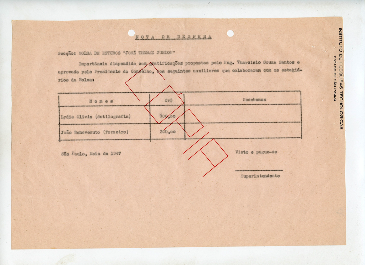 Documentos 01.001.0017.0057 Baixar ApresentaçãoNúmero de registro01.001.0017.0057ConteúdoNota de despesa referente a Bolsa de Estudo José Thomaz Junior. Importância dispendida com gratificações propostas pelo Eng. Tharcisio Souza Santos e aprovada pelo Conselho a auxiliares que colaboraram com os estagiários da Bolsa.GrupoGestão Orçamentária e FinanceiraSubgrupoExecução orçamentária e financeiraSérieRecursos financeirosSuportePapelGêneroTextualData__/__/1947Nível de descriçãoIndividual Metadados TipologiaNota de despesaTécnica de registroDatilografiaFormatoFolhaQuantidade de documentos1 documento, 1 folhaNúmero de Itens do conjunto001MaterialpapelIdiomaPortuguêsProcedênciaDAIT - Departamento de Acervo e Informação Tecnológica Conservação Estado de conservaçãoBomAcondicionamentoCaixa Filifold | Caixa poliondas | Papel glassine Item anteriorRecibo Próximo itemOfício