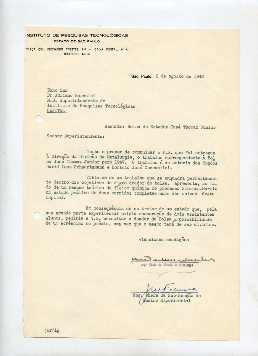 Documentos 01.001.0017.0060 Baixar ApresentaçãoNúmero de registro01.001.0017.0060ConteúdoCorrespondência do Engº Chefe da Divisão de Metalurgia a Adriano Marchini sobre trabalho dos Engenheiros David Leon Schwartsmann e Horacio José Ceccantini correspondente a Bolsa de Estudos José Thomaz JuniorGrupoGestão Orçamentária e FinanceiraSubgrupoExecução orçamentária e financeiraSérieCartas, correspondências, bilhetes, ofícios e memorandosSuportePapelGêneroTextualData__/__/1948Nível de descriçãoIndividual Metadados TipologiaOfícioTécnica de registroDatilografiaFormatoFolhaQuantidade de documentos1 documento, 1 folhaNúmero de Itens do conjunto001MaterialpapelIdiomaPortuguêsProcedênciaDAIT - Departamento de Acervo e Informação Tecnológica Conservação Estado de conservaçãoBomAcondicionamentoCaixa Filifold | Caixa poliondas | Papel glassine Item anteriorDemonstrativo de conta Próximo itemOfício