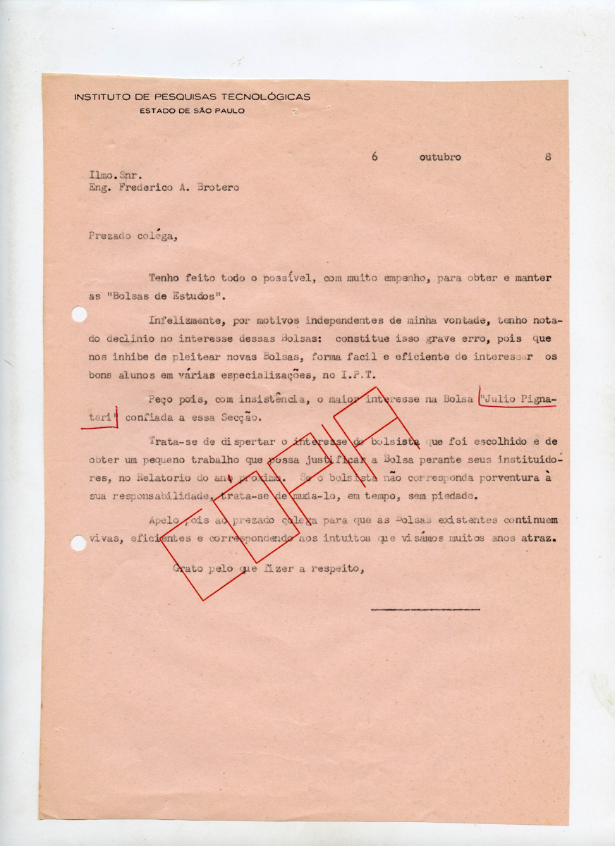 Correpondência enviada a Frederico A. Brotero sobre a Bolsa de Estudos Julio Pignatari