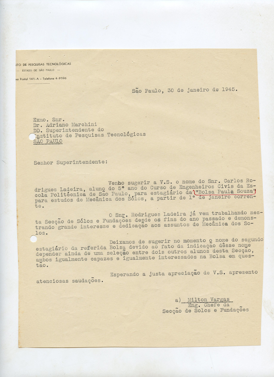 Correspondência de Milton Vargas, chefe da Seção de Solos e Fundações a Adriano Marchini, sugerindo o nome de Carlos Rodrigues Ladeira para estagiário da Bolsa de Estudos Paula Souza.