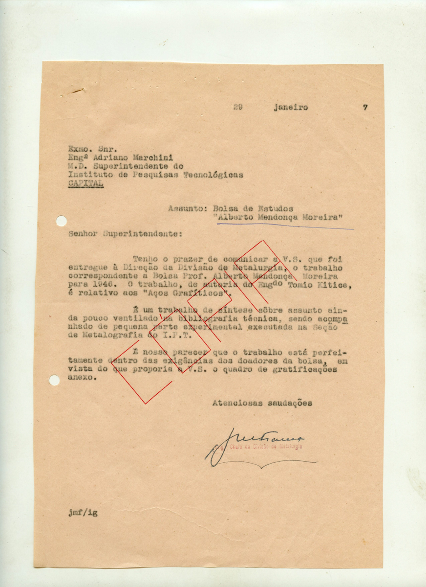 Documentos 01.001.0017.0011 Baixar ApresentaçãoNúmero de registro01.001.0017.0011ConteúdoCorrespondência do eng. Chefe da Usina de Metalurgia a Adriano Marchini sobre trabalho apresentado por Tomio Kitice correspondente a Bolsa de Estudos Alberto Mendonça Moreira.GrupoGestão Orçamentária e FinanceiraSubgrupoExecução orçamentária e financeiraSérieCartas, correspondências, bilhetes, ofícios e memorandosSuportePapelGêneroTextualData__/__/1946Nível de descriçãoIndividual Metadados TipologiaOfícioTécnica de registroDatilografiaFormatoFolhaQuantidade de documentos1 documento, 1 folhaNúmero de Itens do conjunto001MaterialpapelIdiomaPortuguêsProcedênciaDAIT - Departamento de Acervo e Informação Tecnológica Conservação Estado de conservaçãoBomAcondicionamentoCaixa Filifold | Caixa poliondas | Papel glassine Item anteriorQuadro de gratificações Próximo itemQuadro de gratificações