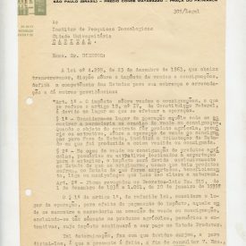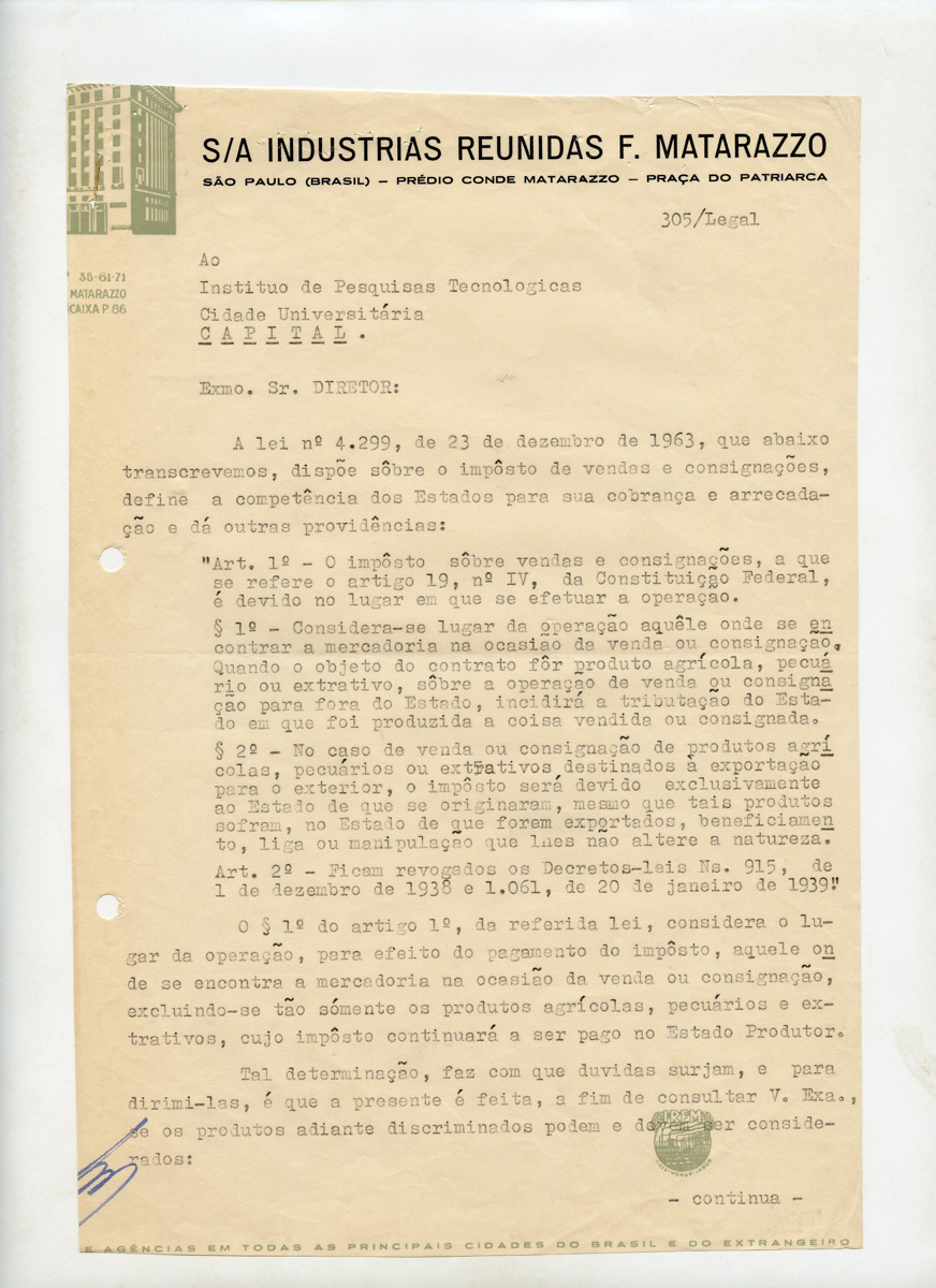 Documento emitido pelas industrias Matarazzo, onde é apresentada ao IPT, a lei nº 4.299, de 23 de dezembro de 1963, que dispõe sobre o imposto de vendas e consignações, define a competência dos Estados para sua cobrança e arrecadação e dá outras providências