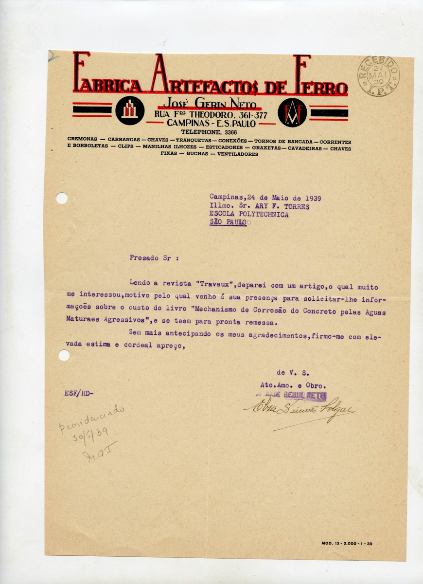 Solicitações do diretor da Fábrica de Artefatos de Ferro José Gerin Neto ao IPT: livro "Mechanismo de Corrosão do Concreto pelas Aguas Naturaes Agressivos"; boletim nº 22, "Exame de 2 pontes rodoviárias"; boletim nº 16; cópia ou tradução do artigo "Kolorimetrisches Schnellverfahren zur Bestimmung des Siliziums in Eisen und Stahl von Hans Pinsl", publicado na revista "Archiv das Eisenhüttenwesen", ano 8 (1934-1935) Heft 3 - pags. 97 à 100