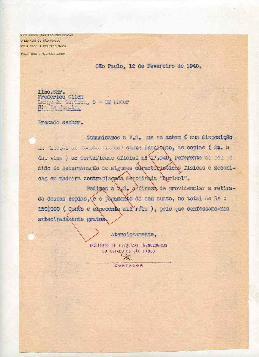 Documentos 01.001.0114.0077 Baixar ApresentaçãoNúmero de registro01.001.0114.0077 | 01.001.0114.0078 | 01.001.0114.0079ConteúdoInfomações de Certificado Official nº 17.940, feito pelo IPT, referente ao pedido de Frederico Click, de determinação de algumas características físicas e mecânicas em madeira contraplacada denominada "Durisol"GrupoMemória InstitucionalSubgrupoMemória da ciênciaSérieDossiêsSuportePapelGêneroTextualData[__/__/1940]Nível de descriçãoConjunto Metadados TipologiaOfícioTécnica de registroDatilografiaFormatoFolhaQuantidade de documentosA4, 3 folhasNúmero de Itens do conjunto003MaterialpapelIdiomaPortuguêsProcedênciaMemória Histórica IPT Conservação Estado de conservaçãoBomOutros aspectos físicosApresenta dobrasAcondicionamentoCaixa Filifold | Papel glassine Itens deste conjunto Mídias dos conjuntosConjunto de itens Ver todos os 3 itens relacionados Item anteriorDeclaração Próximo itemOfício Outros itens deste Grupo 01.020.0024.0001 01.020.0023.0001 01.020.0019.0001 01.020.0016.0001