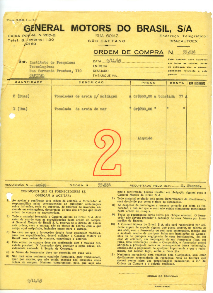 Documentos 01.001.0013.0288 Baixar ApresentaçãoNúmero de registro01.001.0013.0288ConteúdoOrdem de compra da General Motors ao IPT. Ordem numero 55534GrupoGestão Orçamentária e FinanceiraSubgrupoExecução orçamentária e financeiraSérieRecursos financeirosSuportePapelGêneroTextualData__/__/1943Nível de descriçãoIndividual Metadados TipologiaOrdem de compraTécnica de registroDatilografia | ImpressãoFormatoFolhaQuantidade de documentos1 documento, 1 folhaNúmero de Itens do conjunto001MaterialpapelIdiomaPortuguêsProcedênciaMemória Histórica IPT Conservação Estado de conservaçãoBomAcondicionamentoCaixa Filifold | Caixa poliondas | Papel glassine Item anteriorMemorando de cheque Próximo itemOrdem de compra