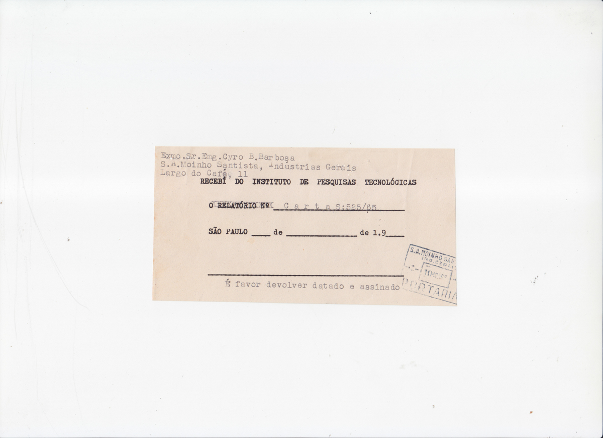 Documentos 01.001.0115.0021 Baixar ApresentaçãoNúmero de registro01.001.0115.0021ConteúdoFuncional; S.A. Moinho Santista, Indústrias Gerais; protocolo de recebimento Carta S:525/65GrupoMemória InstitucionalSubgrupoMemória da ciênciaSérieDossiêsSuportePapelGêneroTextualData[__/__/1955]?Nível de descriçãoIndividual Metadados TipologiaProtocolo de recebimentoTécnica de registroImpressãoFormatoFolhaQuantidade de documentosA4, 1 folhaNúmero de Itens do conjunto001Materialpapel de cartaIdiomaPortuguêsProcedênciaMemória Histórica IPT Conservação Estado de conservaçãoBomAcondicionamentoCaixa Filifold | Papel glassine Item anteriorCorrespondência/Catálogo/Cartão Próximo itemCarta