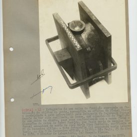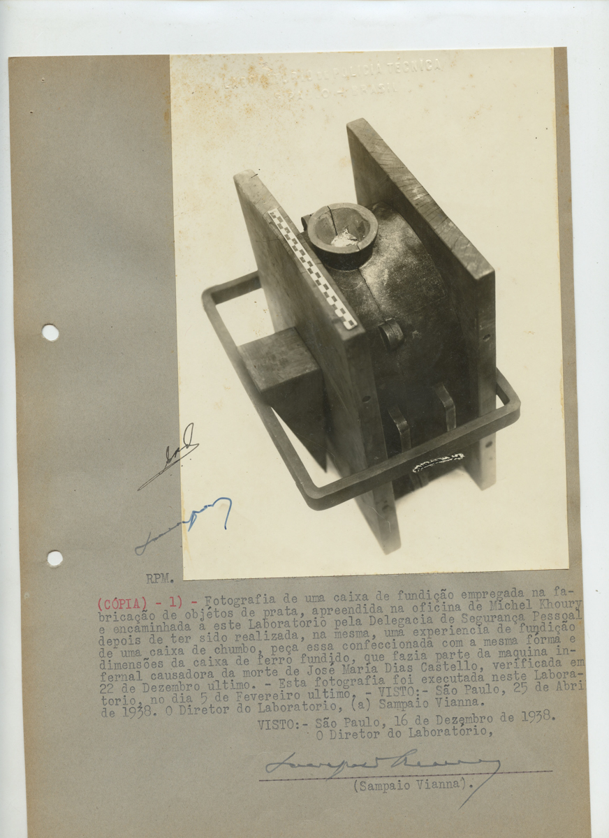 2 FOTOS - Foto 1 – 18,5x14cm. P&B. Foto colada em folha A4. Equipamento. Notação: “ Cópia 1 – Fotografia de uma caixa de fundição empregada na fabricação de objeto de prata, apreendida na oficina de Michem Khoury e encaminhada a este laboratório pela delegacia de segurança pessoal depois de ter sido realidade, na mesma, uma experiencia de fundição de uma caixa de chumbo, peça essa confeccionada com a mesma forma e dimensões da caixa de ferro fundido, que fazia parte da maquina infernal causadora da morte de Jose Maria Dias Castello, verificada em 22 de dezembro último. Esta fotografia foi executada neste laboratório, (a) Sampaio Vianna. Visto: São Paulo, 16 de dezembro de 1938. Sampaio Vianna”. Laboratório de polícia técnica do estado de São Paulo.