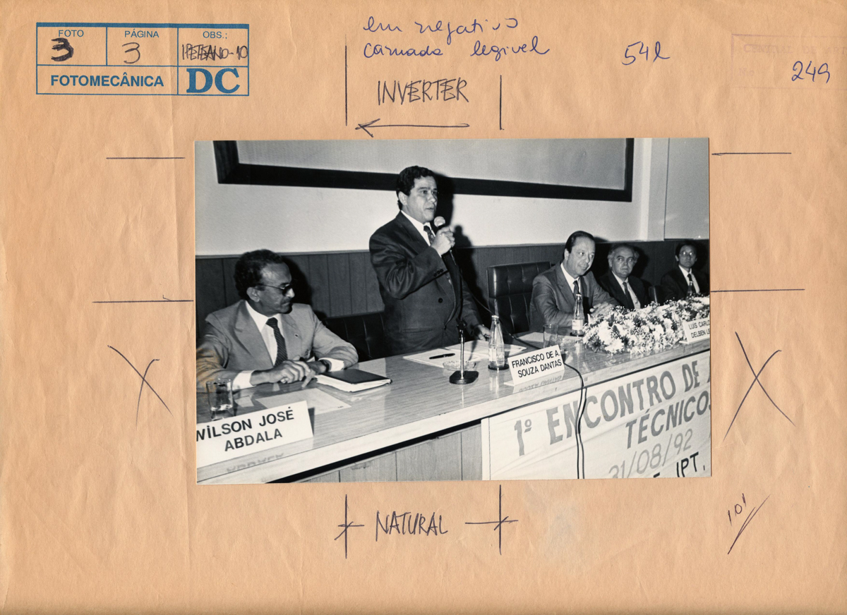 Amostras para ensaio; Seleção de fotografias publicação "IPTEANO 12 e 14": Reunião de funcionários IPT; Funcionário realizando ensaio com equipamento; Imagem de cartaz "CIB 92 - Congrès Mondial Du Bâtiment - World Building Congress"; Assinatura; VIPT - 1988 - Gestão: Oposição 88 (funcionários reunidos com roupa esportiva); Francisco de A. Souza Dantas em congresso de "Encontro Técnico" em 31/08/1992; Funcionário em campo segurando rocha