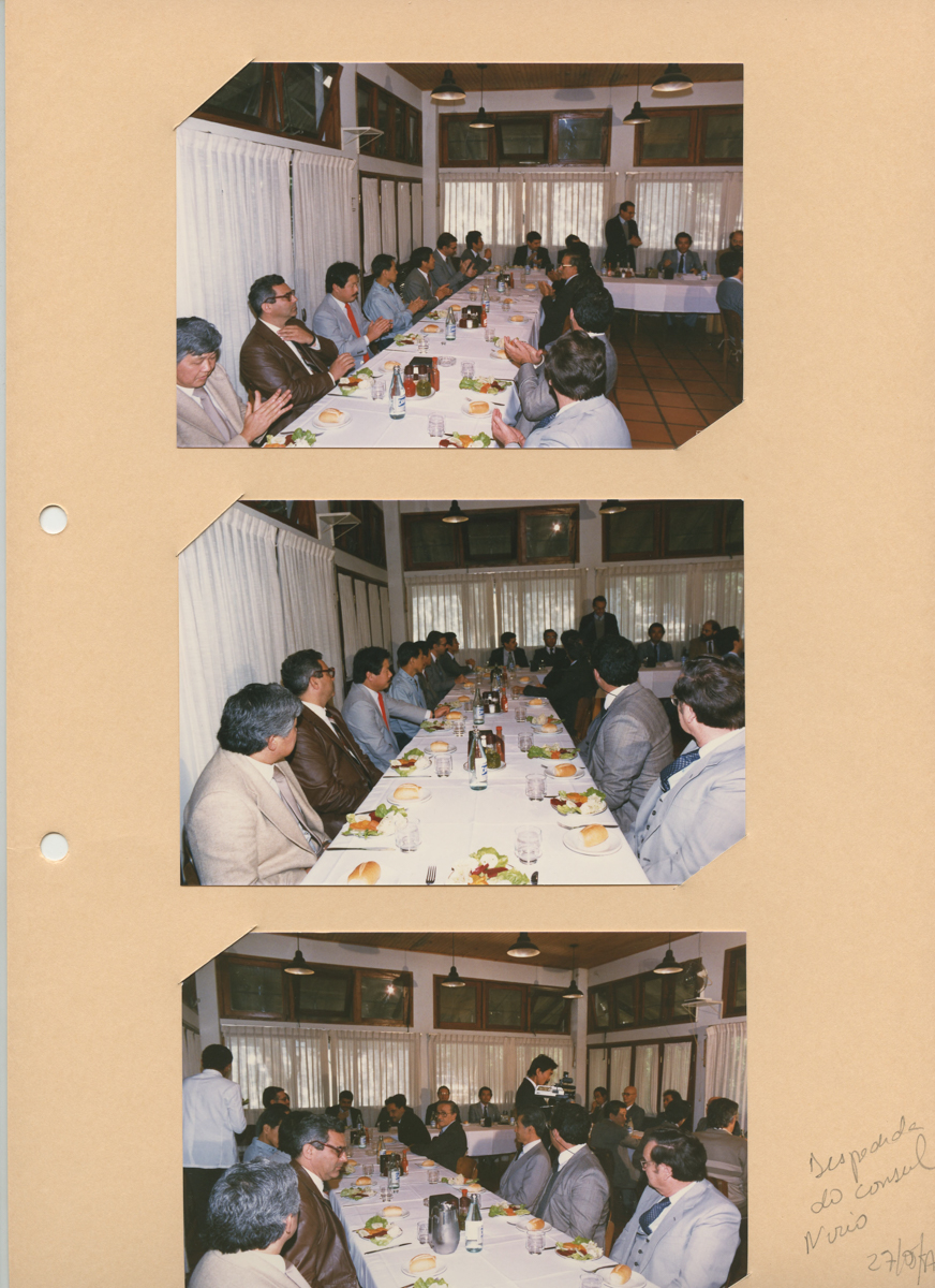 99 FOTOS - Fotos + slides Jica/ 80 anos de imigração japonesa IPT. 99 fotos (Fotos encaixadas em papel cartão com abertura para moldura. 14 cartões com 3 fotos em cada, total de 42 fotos mais 7 fotos avulsas, total de 49) . Não contém slides). Fotos 1 a 3 – 13x9cm. Coloridas. Almoço. Confraternização. “Despedida do cônsul Norio. 27/05/87”. Folha 1. Maio de 1987. Fotos 4 a 6 - 13x9cm. Coloridas. Almoço. Confraternização. “Despedida do cônsul Norio. 27/05/87”. Folha 2. Maio de 1987. Fotos 7 e 8 - 13x9cm. Coloridas. Pessoas em oficina prática. “Curso cerâmica 1989”. Folha 3. 1989. Fotos 9 e 10 - 13x9cm. Coloridas. Pessoas acompanham aula. “Curso cerâmica 1989”. Folha 4. 1989. Fotos 11 e 12 - 13x9cm. Coloridas. Homens em bancada de abertura de congresso. “Curso cerâmica 1989”. Folha 5. 1989. Fotos 13 e 14 - 13x9cm. Coloridas. Pessoas acompanham aula e mulher cumprimenta outra mulher em mesa de congresso. “Curso cerâmica 1989”. Folha 6. 1989. Foto 15 - 13x9cm. Coloridas. Homens em bancada de abertura de congresso. “Curso cerâmica 1989”. Folha 7. 1989. Fotos 16 a 18 - 13x9cm. Coloridas. Homens em bancada de abertura de congresso. Pessoas assistindo aula. Aula prática de oficina. “Curso cerâmica 1989. Jica”. Folha 8. 1989. Fotos 19 a 21 – 13x9cm. Coloridas. Fotos do almoço de confraternização. “Almoço despedida do consul Norio Kovaguchi. 27/05/87”. Folha 9. Maio de 1987. Fotos 22 e 23 – 13x9cm. Coloridas. Homenagem e despedida. “Encerramento do II curso de cerâmica IPT Jica. Hotel Nikkey. 30/06/89”. Folha 10. Junho de 1989. Fotos 24 e 25 – 13x9cm. Coloridas. Visita e aula. “Visita Dimet. Prof. Matsubala. 1991”. Folha 11. 1991. Fotos 26 e 27 - 13x9cm. Coloridas. Aulas. “Curso de cerâmica. Jica. 88”. Folha 12. 1988. Fotos 28 e 29 - 13x9cm. Coloridas. Aulas. “Curso de cerâmica. Jica. Dezembro 88”. Folha 13”. Dezembro de 1988. Fotos 30 a 32 - 13x9cm. Coloridas. “Visita DIMET. Matsubara 1991”. Folha 14. 1991. 7 fotos avulsas de funcionários no IPT e fora de fins de 1980 e inicio de 1990. 5 FOTOS - Foto 1 – 18x12cm. P&B. Homens se cumprimentam em sala de reunião. Verso: “Nabner Celestino. Jul/92”. Junho de 1992. Foto 2 – 18x12cm. P&B. Pessoas em sala de reuniões. Foto 3 – 25x9cm. Colorido. Pessoas posam para foto em estação de esqui. Verso: 13.03.93.Nagano. Maculo, Rosária e Itigo.3”. Março de 1993. Foto 4 – 18x12cm. P&B. Homens plantam muda de arvore. Verso: “Jaika. 15/12/92”. Dezembro de 1992. Foto 5 – 24x18cm. P&B. Homens posam em volta de muda plantada. Verso: “ Jaiica 15/12/92”. Dezembro de 1992. Dimensão (cm): 18x12 / 18x12 / 25x9 / 18x12 / 24x18.E mais 60 fotos referentes ao evento IPT 80 anos.