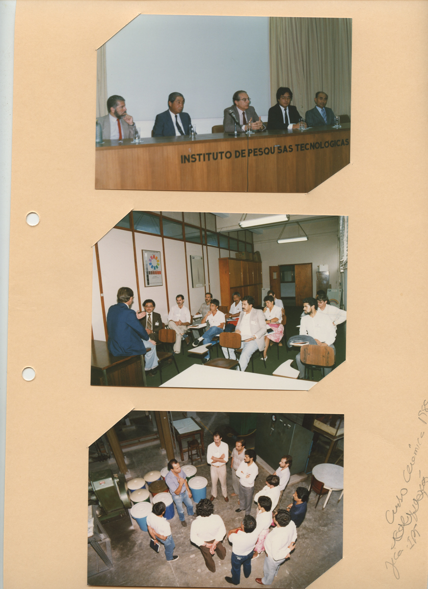 99 FOTOS - Fotos + slides Jica/ 80 anos de imigração japonesa IPT. 99 fotos (Fotos encaixadas em papel cartão com abertura para moldura. 14 cartões com 3 fotos em cada, total de 42 fotos mais 7 fotos avulsas, total de 49) . Não contém slides). Fotos 1 a 3 – 13x9cm. Coloridas. Almoço. Confraternização. “Despedida do cônsul Norio. 27/05/87”. Folha 1. Maio de 1987. Fotos 4 a 6 - 13x9cm. Coloridas. Almoço. Confraternização. “Despedida do cônsul Norio. 27/05/87”. Folha 2. Maio de 1987. Fotos 7 e 8 - 13x9cm. Coloridas. Pessoas em oficina prática. “Curso cerâmica 1989”. Folha 3. 1989. Fotos 9 e 10 - 13x9cm. Coloridas. Pessoas acompanham aula. “Curso cerâmica 1989”. Folha 4. 1989. Fotos 11 e 12 - 13x9cm. Coloridas. Homens em bancada de abertura de congresso. “Curso cerâmica 1989”. Folha 5. 1989. Fotos 13 e 14 - 13x9cm. Coloridas. Pessoas acompanham aula e mulher cumprimenta outra mulher em mesa de congresso. “Curso cerâmica 1989”. Folha 6. 1989. Foto 15 - 13x9cm. Coloridas. Homens em bancada de abertura de congresso. “Curso cerâmica 1989”. Folha 7. 1989. Fotos 16 a 18 - 13x9cm. Coloridas. Homens em bancada de abertura de congresso. Pessoas assistindo aula. Aula prática de oficina. “Curso cerâmica 1989. Jica”. Folha 8. 1989. Fotos 19 a 21 – 13x9cm. Coloridas. Fotos do almoço de confraternização. “Almoço despedida do consul Norio Kovaguchi. 27/05/87”. Folha 9. Maio de 1987. Fotos 22 e 23 – 13x9cm. Coloridas. Homenagem e despedida. “Encerramento do II curso de cerâmica IPT Jica. Hotel Nikkey. 30/06/89”. Folha 10. Junho de 1989. Fotos 24 e 25 – 13x9cm. Coloridas. Visita e aula. “Visita Dimet. Prof. Matsubala. 1991”. Folha 11. 1991. Fotos 26 e 27 - 13x9cm. Coloridas. Aulas. “Curso de cerâmica. Jica. 88”. Folha 12. 1988. Fotos 28 e 29 - 13x9cm. Coloridas. Aulas. “Curso de cerâmica. Jica. Dezembro 88”. Folha 13”. Dezembro de 1988. Fotos 30 a 32 - 13x9cm. Coloridas. “Visita DIMET. Matsubara 1991”. Folha 14. 1991. 7 fotos avulsas de funcionários no IPT e fora de fins de 1980 e inicio de 1990. 5 FOTOS - Foto 1 – 18x12cm. P&B. Homens se cumprimentam em sala de reunião. Verso: “Nabner Celestino. Jul/92”. Junho de 1992. Foto 2 – 18x12cm. P&B. Pessoas em sala de reuniões. Foto 3 – 25x9cm. Colorido. Pessoas posam para foto em estação de esqui. Verso: 13.03.93.Nagano. Maculo, Rosária e Itigo.3”. Março de 1993. Foto 4 – 18x12cm. P&B. Homens plantam muda de arvore. Verso: “Jaika. 15/12/92”. Dezembro de 1992. Foto 5 – 24x18cm. P&B. Homens posam em volta de muda plantada. Verso: “ Jaiica 15/12/92”. Dezembro de 1992. Dimensão (cm): 18x12 / 18x12 / 25x9 / 18x12 / 24x18.E mais 60 fotos referentes ao evento IPT 80 anos.