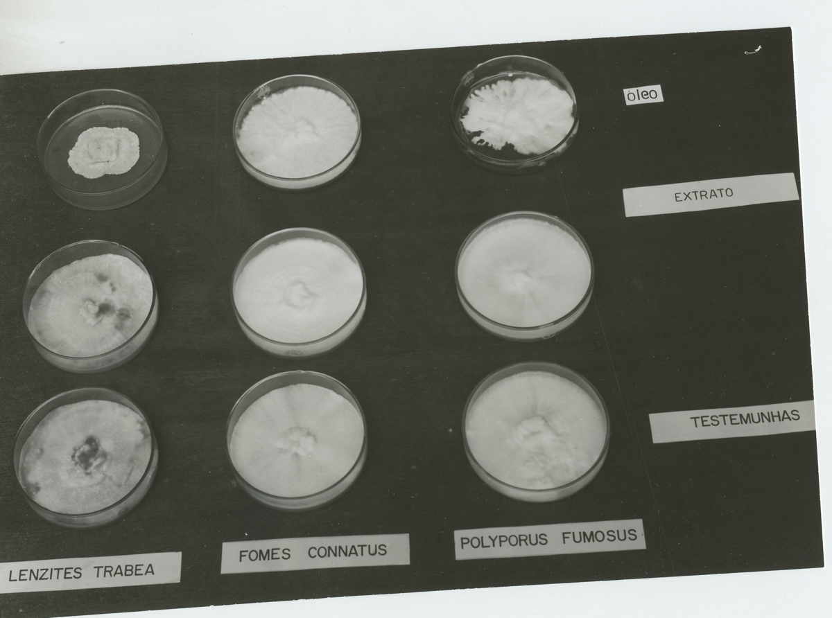 138 FOTOS. (+19 cópias). Foto 1 – Revelação de negativo. Linha horizontal. 4 imagens de um mesmo homem. Frente “Kodak 5063TX” P&B. 15,5x5,5cm. Foto 2 – Equipamento. Verso: “Foto. CR22. Ensaios Físicos e mecânicos. Maquina para ensaios. Pm-b”. P&B. 16x11cm. Foto 3 – Equipamento de vidro. Verso: “ 980”. P&B. 17x10,5cm. Foto 4 – Amostra vista de 4 formas. Frente: “ nº3”. Verso: “ Corpo de prova. Cenexos (?), para certificado oficial. 962”. P&B. 15x11cm. Foto 5 – 17x9cm. P&B. Amostra de 3 cortes de tronco. Verso: “964”. Foto 6 – 17x8cm. P&B. 5 amostras de madeira. Verso: “Foto. Corpo de provas. Expostos ao ataque de cupins (certificação de Brumosa (?)) Sr. Preservação de Mader. 963”. Foto 7 – 15x11cm. P&B. Duas peças de madeira. Frente: “1.2.S3”. Verso: “ 1004”. Foto 8 - 15x11cm. P&B. Duas peças de madeira. Frente: “1.2.D1”. Verso: “ 1005”. Foto 9 - 15x11cm. P&B. Duas peças de madeira. Frente: “1.2.D2”. Verso: “ 1006. Foto. Ensaio combustibilidade solidor E.Divisão.”. Foto 10 – 15x11cm. P&B. Duas peças de madeira. Frente: “1.2.D3”. Verso: “ 1007”. Foto 11 – 16,5x11cm. P&B. Três amostras de madeira. Verso: “Foto Corpo de prova anexo – (ensaio de cupim / luler(?).duratex s/a. 1008”. Foto 12 - 16,5x11cm. P&B. Três amostras de madeira. Frente: 1.7.0”. Verso: “Foto. Ensaio de atacabilidade de cupins. Ilegível. 1009”. Foto 13 - 16,5x11cm. P&B. Quatro amostras de madeira. Frente: “2.6.7.8”. Verso: “Foto 1010”. Foto 14 - 16,5x11cm. P&B. Três amostras de madeira. Frente: “5.6.8”. Verso: “Foto. Ensaio de atacabilidade de cupins. Ilegível. 1011”. Foto 15 - 16,5x11cm. P&B. Três amostras de madeira. Frente: 2.4.9”. Verso: “Foto. Ensaio de atacabilidade de cupins. Ilegível. 1012”. Foto 16 - 16,5x11cm. P&B. Quatro amostras de madeira. Frente: “1.2.5.7”. Verso: “Foto 1013”. Foto 17 - 16,5x11cm. P&B. Quatro amostras de madeira. Frente: “2.3.4.6”. Verso: “Foto ensaio sobre resistência a cupim. Ilegível. Duratex s/a. 1014. 1”. Foto 18 - 16,5x11cm. P&B. Quatro amostras de madeira. Frente: “1.8.5.7”. Verso: “1015”. Foto 19 - 16,5x11cm. P&B. Seis amostras de madeira. Frente: “1/J-T. 2/J-T. 3/J-F. 6/J-F. 3/J-Bb. 6/J-Bb. ”. Verso: “1018”. Foto 20 – Cópia da foto 19. Foto 21 - 16,5x11cm. P&B. Seis amostras de madeira. Frente: “1/C-T. 2/C-T. 1/1C-F. 2/1C-F. 1/1C-B. 2/1C-B”. Verso: “1017”. Foto 22 - 16,5x11cm. P&B. Seis amostras de madeira. Frente: “1/2C-B. 2/2C-B. 1/2C-F. 2/2C-F. 1/2C-T. 2/2C-T.”. Verso: “Foto. Corpo de provas atacado por cupins ent. Duratex s/c” 1016. 3 ilegível. Foto 23 - 16,5x11cm. P&B. Quatro amostras de madeira. Frente: “1.8.5.7”. Verso: “Foto Ensaio ilegível. 1015”. Foto 24 – 16x10cm. P&B. Três amostras de madeira. Frente: “S-1. S-2. S-3”. Verso: “Corpos de provas atacados por cupins. Duratex. 1019. 15-9-70”. Data provável: 15-9-1970. Foto 25 - 16x10cm. P&B. Três amostras de madeira. Frente: “B-1. B-2. B-3.”. Verso: “Foto corpos de provas atacados por cupins. 1020. Ilegível. 10-9-70”. Data provável: 15-9-1970. Foto 26. Cópia foto 25. Foto 27 – 16x10cm. P&B. Três amostras de madeira. Frente: “T-1. T-2. T-3.”. Verso: “1021.”. Foto 28 - 16x10cm. P&B. Três amostras de madeira. Frente: “4217/8. 4217/7. 421/9”. Verso: “Foto ensaio de atacabilidade de cupins. 1022. Ilegível. Duratex s/a”. Foto 29 – 16x10cm. P&B. Três amostras de madeira. Frente: “421/1. 4217/2. 4217/6. Verso: “Foto Ensaio de atacabilidade de cupins. 1023. Ilegível. Duratex s/a”. Foto 30 – 16x10cm. P&B. Três amostras de madeira. Frente: “421/3. 4217/4. 4217/8”. Verso: “Foto Ensaio de atacabilidade de cupins. 1024. Ilegível. Duratex s/a”. Foto 31 – Cópia da foto 30. Foto 32 – 16x10cm. P&B. Três amostras de madeira. Frente: “B.M.T” Verso: “Foto Poste para ensaio de penetração de preservativos. 1025”. Foto 33 – Cópia foto 32. Foto 34 – 15x7cm. P&B. Quatro frascos de vidro com tampas com amostras. Verso: “Foto conjunto de frascos contendo material atacado. Ensaio placa 5aa. MD. 951”. Foto 35 – 16x10cm. P&B. Dezesseis amostras. Frente: “1.2”. Verso: “ D.m. 950. Foto conjunto de placa Petri. Ensaio de tintas. Resistência de bolory(?). Paca prema s/a”. Foto 36 – 17x10. P&B. Doze amostras. Frente: “ Testemunhas. Extrato. Polyporus fumosus. Fomes connatus. Lenzites trabea. 1.2”. Verso: “957. Estrtativos de madeira com atividades antifúgicas [sic]”. Foto 37 – Cópia da foto 36. Foto 38 – Cópia da foto 36. Foto 39 – 17x9cm. P&B. Seis amostras. Frente: “Polyporus Fumosus. Fomes Cannatus. Lenzites Trabea. Extrato. Testemunhas”. Verso: Foto 958. Progeto [sic] sobre estudos de estudos de extrativos com atividade antifúngica”. Foto 40 – 17x9cm. P&B. Seis amostras. Frente: “Polyporus Fumosus. Fomes Cannatus. Lenzites Trabea. Extrato. Testemunhas”. Verso: “Foto 959”. Foto 41 – Cópia foto 40. Foto 42 – 17x9cm. P&B. Seis amostras. Frente: “Polyporus Fumosus. Fomes Cannatus. Lenzites Trabea. Extrato. Testemunhas”. Verso: “Foto 956”. Foto 43 – 16x10cm. P&B. Nove amostras. Frente” 1.2.Testemunhas.Polyporus fumosus. Fomes Connatus. Lenzites Straita”. Verso: “960. Foto. Estrativos de madeira com atividade autifugica [sic]”. Foto 44 – Cópia da foto 43. Foto 45 – 16x10cm. Quatro amostras. Frente: “Lenzites trabea. Fomes connatus. Polyporus fumosus. Extrato. Testemunhas”. Verso “961”. Foto 46 – Cópia da foto 45. Foto 47 – 16x10,5cm. Doze amostras. Frente: “Lenzites trabea. Fomes connatus. Plyporus fumosus”. Verso: “Foto ensaio biológico de estrato de madeira. (Progeto [sic] autifingicos de madeira nacional. Extrativo de madeiras. 1031”. Foto 48. 16x10,5cm. P&B. Sete amostras. Verso: “Foto. Ensaio de resistência ao ataque de cupins. Relatório de Duratex s/a. S madeira. 983”. Foto 