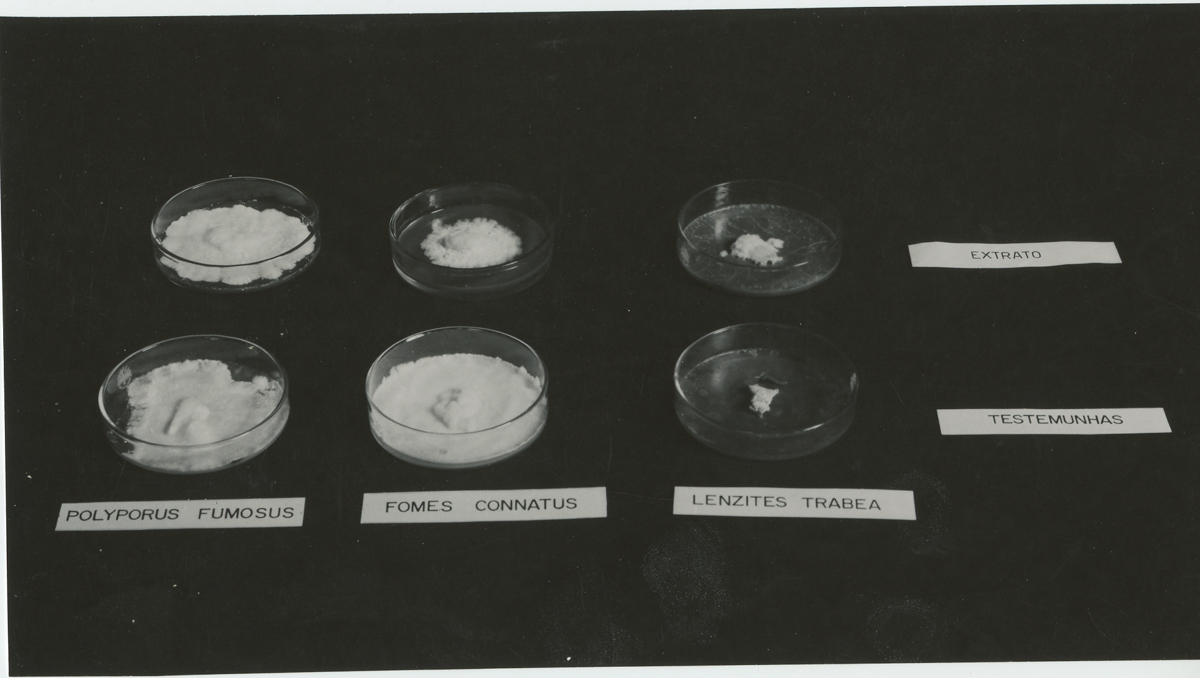 138 FOTOS. (+19 cópias). Foto 1 – Revelação de negativo. Linha horizontal. 4 imagens de um mesmo homem. Frente “Kodak 5063TX” P&B. 15,5x5,5cm. Foto 2 – Equipamento. Verso: “Foto. CR22. Ensaios Físicos e mecânicos. Maquina para ensaios. Pm-b”. P&B. 16x11cm. Foto 3 – Equipamento de vidro. Verso: “ 980”. P&B. 17x10,5cm. Foto 4 – Amostra vista de 4 formas. Frente: “ nº3”. Verso: “ Corpo de prova. Cenexos (?), para certificado oficial. 962”. P&B. 15x11cm. Foto 5 – 17x9cm. P&B. Amostra de 3 cortes de tronco. Verso: “964”. Foto 6 – 17x8cm. P&B. 5 amostras de madeira. Verso: “Foto. Corpo de provas. Expostos ao ataque de cupins (certificação de Brumosa (?)) Sr. Preservação de Mader. 963”. Foto 7 – 15x11cm. P&B. Duas peças de madeira. Frente: “1.2.S3”. Verso: “ 1004”. Foto 8 - 15x11cm. P&B. Duas peças de madeira. Frente: “1.2.D1”. Verso: “ 1005”. Foto 9 - 15x11cm. P&B. Duas peças de madeira. Frente: “1.2.D2”. Verso: “ 1006. Foto. Ensaio combustibilidade solidor E.Divisão.”. Foto 10 – 15x11cm. P&B. Duas peças de madeira. Frente: “1.2.D3”. Verso: “ 1007”. Foto 11 – 16,5x11cm. P&B. Três amostras de madeira. Verso: “Foto Corpo de prova anexo – (ensaio de cupim / luler(?).duratex s/a. 1008”. Foto 12 - 16,5x11cm. P&B. Três amostras de madeira. Frente: 1.7.0”. Verso: “Foto. Ensaio de atacabilidade de cupins. Ilegível. 1009”. Foto 13 - 16,5x11cm. P&B. Quatro amostras de madeira. Frente: “2.6.7.8”. Verso: “Foto 1010”. Foto 14 - 16,5x11cm. P&B. Três amostras de madeira. Frente: “5.6.8”. Verso: “Foto. Ensaio de atacabilidade de cupins. Ilegível. 1011”. Foto 15 - 16,5x11cm. P&B. Três amostras de madeira. Frente: 2.4.9”. Verso: “Foto. Ensaio de atacabilidade de cupins. Ilegível. 1012”. Foto 16 - 16,5x11cm. P&B. Quatro amostras de madeira. Frente: “1.2.5.7”. Verso: “Foto 1013”. Foto 17 - 16,5x11cm. P&B. Quatro amostras de madeira. Frente: “2.3.4.6”. Verso: “Foto ensaio sobre resistência a cupim. Ilegível. Duratex s/a. 1014. 1”. Foto 18 - 16,5x11cm. P&B. Quatro amostras de madeira. Frente: “1.8.5.7”. Verso: “1015”. Foto 19 - 16,5x11cm. P&B. Seis amostras de madeira. Frente: “1/J-T. 2/J-T. 3/J-F. 6/J-F. 3/J-Bb. 6/J-Bb. ”. Verso: “1018”. Foto 20 – Cópia da foto 19. Foto 21 - 16,5x11cm. P&B. Seis amostras de madeira. Frente: “1/C-T. 2/C-T. 1/1C-F. 2/1C-F. 1/1C-B. 2/1C-B”. Verso: “1017”. Foto 22 - 16,5x11cm. P&B. Seis amostras de madeira. Frente: “1/2C-B. 2/2C-B. 1/2C-F. 2/2C-F. 1/2C-T. 2/2C-T.”. Verso: “Foto. Corpo de provas atacado por cupins ent. Duratex s/c” 1016. 3 ilegível. Foto 23 - 16,5x11cm. P&B. Quatro amostras de madeira. Frente: “1.8.5.7”. Verso: “Foto Ensaio ilegível. 1015”. Foto 24 – 16x10cm. P&B. Três amostras de madeira. Frente: “S-1. S-2. S-3”. Verso: “Corpos de provas atacados por cupins. Duratex. 1019. 15-9-70”. Data provável: 15-9-1970. Foto 25 - 16x10cm. P&B. Três amostras de madeira. Frente: “B-1. B-2. B-3.”. Verso: “Foto corpos de provas atacados por cupins. 1020. Ilegível. 10-9-70”. Data provável: 15-9-1970. Foto 26. Cópia foto 25. Foto 27 – 16x10cm. P&B. Três amostras de madeira. Frente: “T-1. T-2. T-3.”. Verso: “1021.”. Foto 28 - 16x10cm. P&B. Três amostras de madeira. Frente: “4217/8. 4217/7. 421/9”. Verso: “Foto ensaio de atacabilidade de cupins. 1022. Ilegível. Duratex s/a”. Foto 29 – 16x10cm. P&B. Três amostras de madeira. Frente: “421/1. 4217/2. 4217/6. Verso: “Foto Ensaio de atacabilidade de cupins. 1023. Ilegível. Duratex s/a”. Foto 30 – 16x10cm. P&B. Três amostras de madeira. Frente: “421/3. 4217/4. 4217/8”. Verso: “Foto Ensaio de atacabilidade de cupins. 1024. Ilegível. Duratex s/a”. Foto 31 – Cópia da foto 30. Foto 32 – 16x10cm. P&B. Três amostras de madeira. Frente: “B.M.T” Verso: “Foto Poste para ensaio de penetração de preservativos. 1025”. Foto 33 – Cópia foto 32. Foto 34 – 15x7cm. P&B. Quatro frascos de vidro com tampas com amostras. Verso: “Foto conjunto de frascos contendo material atacado. Ensaio placa 5aa. MD. 951”. Foto 35 – 16x10cm. P&B. Dezesseis amostras. Frente: “1.2”. Verso: “ D.m. 950. Foto conjunto de placa Petri. Ensaio de tintas. Resistência de bolory(?). Paca prema s/a”. Foto 36 – 17x10. P&B. Doze amostras. Frente: “ Testemunhas. Extrato. Polyporus fumosus. Fomes connatus. Lenzites trabea. 1.2”. Verso: “957. Estrtativos de madeira com atividades antifúgicas [sic]”. Foto 37 – Cópia da foto 36. Foto 38 – Cópia da foto 36. Foto 39 – 17x9cm. P&B. Seis amostras. Frente: “Polyporus Fumosus. Fomes Cannatus. Lenzites Trabea. Extrato. Testemunhas”. Verso: Foto 958. Progeto [sic] sobre estudos de estudos de extrativos com atividade antifúngica”. Foto 40 – 17x9cm. P&B. Seis amostras. Frente: “Polyporus Fumosus. Fomes Cannatus. Lenzites Trabea. Extrato. Testemunhas”. Verso: “Foto 959”. Foto 41 – Cópia foto 40. Foto 42 – 17x9cm. P&B. Seis amostras. Frente: “Polyporus Fumosus. Fomes Cannatus. Lenzites Trabea. Extrato. Testemunhas”. Verso: “Foto 956”. Foto 43 – 16x10cm. P&B. Nove amostras. Frente” 1.2.Testemunhas.Polyporus fumosus. Fomes Connatus. Lenzites Straita”. Verso: “960. Foto. Estrativos de madeira com atividade autifugica [sic]”. Foto 44 – Cópia da foto 43. Foto 45 – 16x10cm. Quatro amostras. Frente: “Lenzites trabea. Fomes connatus. Polyporus fumosus. Extrato. Testemunhas”. Verso “961”. Foto 46 – Cópia da foto 45. Foto 47 – 16x10,5cm. Doze amostras. Frente: “Lenzites trabea. Fomes connatus. Plyporus fumosus”. Verso: “Foto ensaio biológico de estrato de madeira. (Progeto [sic] autifingicos de madeira nacional. Extrativo de madeiras. 1031”. Foto 48. 16x10,5cm. P&B. Sete amostras. Verso: “Foto. Ensaio de resistência ao ataque de cupins. Relatório de Duratex s/a. S madeira. 983”. Foto 