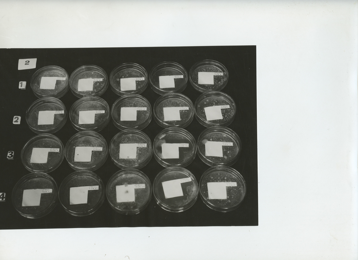 138 FOTOS. (+19 cópias). Foto 1 – Revelação de negativo. Linha horizontal. 4 imagens de um mesmo homem. Frente “Kodak 5063TX” P&B. 15,5x5,5cm. Foto 2 – Equipamento. Verso: “Foto. CR22. Ensaios Físicos e mecânicos. Maquina para ensaios. Pm-b”. P&B. 16x11cm. Foto 3 – Equipamento de vidro. Verso: “ 980”. P&B. 17x10,5cm. Foto 4 – Amostra vista de 4 formas. Frente: “ nº3”. Verso: “ Corpo de prova. Cenexos (?), para certificado oficial. 962”. P&B. 15x11cm. Foto 5 – 17x9cm. P&B. Amostra de 3 cortes de tronco. Verso: “964”. Foto 6 – 17x8cm. P&B. 5 amostras de madeira. Verso: “Foto. Corpo de provas. Expostos ao ataque de cupins (certificação de Brumosa (?)) Sr. Preservação de Mader. 963”. Foto 7 – 15x11cm. P&B. Duas peças de madeira. Frente: “1.2.S3”. Verso: “ 1004”. Foto 8 - 15x11cm. P&B. Duas peças de madeira. Frente: “1.2.D1”. Verso: “ 1005”. Foto 9 - 15x11cm. P&B. Duas peças de madeira. Frente: “1.2.D2”. Verso: “ 1006. Foto. Ensaio combustibilidade solidor E.Divisão.”. Foto 10 – 15x11cm. P&B. Duas peças de madeira. Frente: “1.2.D3”. Verso: “ 1007”. Foto 11 – 16,5x11cm. P&B. Três amostras de madeira. Verso: “Foto Corpo de prova anexo – (ensaio de cupim / luler(?).duratex s/a. 1008”. Foto 12 - 16,5x11cm. P&B. Três amostras de madeira. Frente: 1.7.0”. Verso: “Foto. Ensaio de atacabilidade de cupins. Ilegível. 1009”. Foto 13 - 16,5x11cm. P&B. Quatro amostras de madeira. Frente: “2.6.7.8”. Verso: “Foto 1010”. Foto 14 - 16,5x11cm. P&B. Três amostras de madeira. Frente: “5.6.8”. Verso: “Foto. Ensaio de atacabilidade de cupins. Ilegível. 1011”. Foto 15 - 16,5x11cm. P&B. Três amostras de madeira. Frente: 2.4.9”. Verso: “Foto. Ensaio de atacabilidade de cupins. Ilegível. 1012”. Foto 16 - 16,5x11cm. P&B. Quatro amostras de madeira. Frente: “1.2.5.7”. Verso: “Foto 1013”. Foto 17 - 16,5x11cm. P&B. Quatro amostras de madeira. Frente: “2.3.4.6”. Verso: “Foto ensaio sobre resistência a cupim. Ilegível. Duratex s/a. 1014. 1”. Foto 18 - 16,5x11cm. P&B. Quatro amostras de madeira. Frente: “1.8.5.7”. Verso: “1015”. Foto 19 - 16,5x11cm. P&B. Seis amostras de madeira. Frente: “1/J-T. 2/J-T. 3/J-F. 6/J-F. 3/J-Bb. 6/J-Bb. ”. Verso: “1018”. Foto 20 – Cópia da foto 19. Foto 21 - 16,5x11cm. P&B. Seis amostras de madeira. Frente: “1/C-T. 2/C-T. 1/1C-F. 2/1C-F. 1/1C-B. 2/1C-B”. Verso: “1017”. Foto 22 - 16,5x11cm. P&B. Seis amostras de madeira. Frente: “1/2C-B. 2/2C-B. 1/2C-F. 2/2C-F. 1/2C-T. 2/2C-T.”. Verso: “Foto. Corpo de provas atacado por cupins ent. Duratex s/c” 1016. 3 ilegível. Foto 23 - 16,5x11cm. P&B. Quatro amostras de madeira. Frente: “1.8.5.7”. Verso: “Foto Ensaio ilegível. 1015”. Foto 24 – 16x10cm. P&B. Três amostras de madeira. Frente: “S-1. S-2. S-3”. Verso: “Corpos de provas atacados por cupins. Duratex. 1019. 15-9-70”. Data provável: 15-9-1970. Foto 25 - 16x10cm. P&B. Três amostras de madeira. Frente: “B-1. B-2. B-3.”. Verso: “Foto corpos de provas atacados por cupins. 1020. Ilegível. 10-9-70”. Data provável: 15-9-1970. Foto 26. Cópia foto 25. Foto 27 – 16x10cm. P&B. Três amostras de madeira. Frente: “T-1. T-2. T-3.”. Verso: “1021.”. Foto 28 - 16x10cm. P&B. Três amostras de madeira. Frente: “4217/8. 4217/7. 421/9”. Verso: “Foto ensaio de atacabilidade de cupins. 1022. Ilegível. Duratex s/a”. Foto 29 – 16x10cm. P&B. Três amostras de madeira. Frente: “421/1. 4217/2. 4217/6. Verso: “Foto Ensaio de atacabilidade de cupins. 1023. Ilegível. Duratex s/a”. Foto 30 – 16x10cm. P&B. Três amostras de madeira. Frente: “421/3. 4217/4. 4217/8”. Verso: “Foto Ensaio de atacabilidade de cupins. 1024. Ilegível. Duratex s/a”. Foto 31 – Cópia da foto 30. Foto 32 – 16x10cm. P&B. Três amostras de madeira. Frente: “B.M.T” Verso: “Foto Poste para ensaio de penetração de preservativos. 1025”. Foto 33 – Cópia foto 32. Foto 34 – 15x7cm. P&B. Quatro frascos de vidro com tampas com amostras. Verso: “Foto conjunto de frascos contendo material atacado. Ensaio placa 5aa. MD. 951”. Foto 35 – 16x10cm. P&B. Dezesseis amostras. Frente: “1.2”. Verso: “ D.m. 950. Foto conjunto de placa Petri. Ensaio de tintas. Resistência de bolory(?). Paca prema s/a”. Foto 36 – 17x10. P&B. Doze amostras. Frente: “ Testemunhas. Extrato. Polyporus fumosus. Fomes connatus. Lenzites trabea. 1.2”. Verso: “957. Estrtativos de madeira com atividades antifúgicas [sic]”. Foto 37 – Cópia da foto 36. Foto 38 – Cópia da foto 36. Foto 39 – 17x9cm. P&B. Seis amostras. Frente: “Polyporus Fumosus. Fomes Cannatus. Lenzites Trabea. Extrato. Testemunhas”. Verso: Foto 958. Progeto [sic] sobre estudos de estudos de extrativos com atividade antifúngica”. Foto 40 – 17x9cm. P&B. Seis amostras. Frente: “Polyporus Fumosus. Fomes Cannatus. Lenzites Trabea. Extrato. Testemunhas”. Verso: “Foto 959”. Foto 41 – Cópia foto 40. Foto 42 – 17x9cm. P&B. Seis amostras. Frente: “Polyporus Fumosus. Fomes Cannatus. Lenzites Trabea. Extrato. Testemunhas”. Verso: “Foto 956”. Foto 43 – 16x10cm. P&B. Nove amostras. Frente” 1.2.Testemunhas.Polyporus fumosus. Fomes Connatus. Lenzites Straita”. Verso: “960. Foto. Estrativos de madeira com atividade autifugica [sic]”. Foto 44 – Cópia da foto 43. Foto 45 – 16x10cm. Quatro amostras. Frente: “Lenzites trabea. Fomes connatus. Polyporus fumosus. Extrato. Testemunhas”. Verso “961”. Foto 46 – Cópia da foto 45. Foto 47 – 16x10,5cm. Doze amostras. Frente: “Lenzites trabea. Fomes connatus. Plyporus fumosus”. Verso: “Foto ensaio biológico de estrato de madeira. (Progeto [sic] autifingicos de madeira nacional. Extrativo de madeiras. 1031”. Foto 48. 16x10,5cm. P&B. Sete amostras. Verso: “Foto. Ensaio de resistência ao ataque de cupins. Relatório de Duratex s/a. S madeira. 983”. Foto 