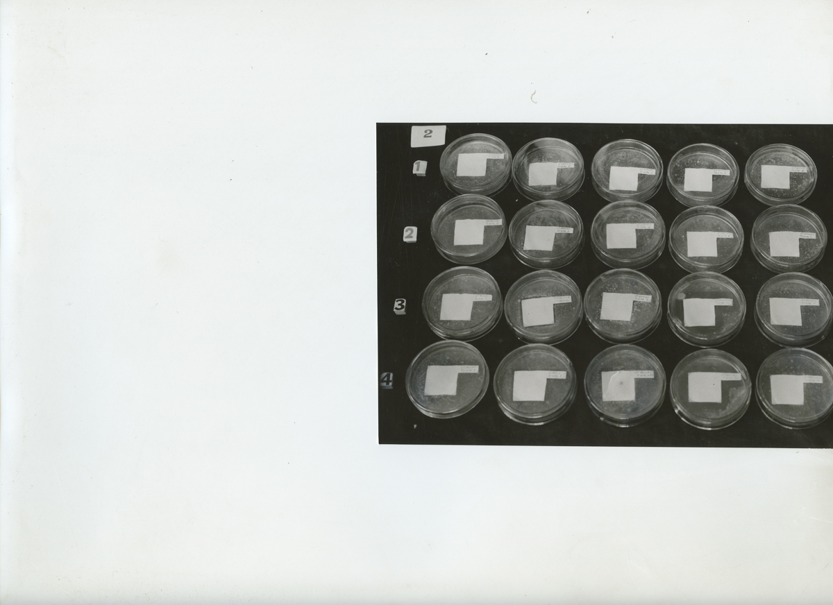 138 FOTOS. (+19 cópias). Foto 1 – Revelação de negativo. Linha horizontal. 4 imagens de um mesmo homem. Frente “Kodak 5063TX” P&B. 15,5x5,5cm. Foto 2 – Equipamento. Verso: “Foto. CR22. Ensaios Físicos e mecânicos. Maquina para ensaios. Pm-b”. P&B. 16x11cm. Foto 3 – Equipamento de vidro. Verso: “ 980”. P&B. 17x10,5cm. Foto 4 – Amostra vista de 4 formas. Frente: “ nº3”. Verso: “ Corpo de prova. Cenexos (?), para certificado oficial. 962”. P&B. 15x11cm. Foto 5 – 17x9cm. P&B. Amostra de 3 cortes de tronco. Verso: “964”. Foto 6 – 17x8cm. P&B. 5 amostras de madeira. Verso: “Foto. Corpo de provas. Expostos ao ataque de cupins (certificação de Brumosa (?)) Sr. Preservação de Mader. 963”. Foto 7 – 15x11cm. P&B. Duas peças de madeira. Frente: “1.2.S3”. Verso: “ 1004”. Foto 8 - 15x11cm. P&B. Duas peças de madeira. Frente: “1.2.D1”. Verso: “ 1005”. Foto 9 - 15x11cm. P&B. Duas peças de madeira. Frente: “1.2.D2”. Verso: “ 1006. Foto. Ensaio combustibilidade solidor E.Divisão.”. Foto 10 – 15x11cm. P&B. Duas peças de madeira. Frente: “1.2.D3”. Verso: “ 1007”. Foto 11 – 16,5x11cm. P&B. Três amostras de madeira. Verso: “Foto Corpo de prova anexo – (ensaio de cupim / luler(?).duratex s/a. 1008”. Foto 12 - 16,5x11cm. P&B. Três amostras de madeira. Frente: 1.7.0”. Verso: “Foto. Ensaio de atacabilidade de cupins. Ilegível. 1009”. Foto 13 - 16,5x11cm. P&B. Quatro amostras de madeira. Frente: “2.6.7.8”. Verso: “Foto 1010”. Foto 14 - 16,5x11cm. P&B. Três amostras de madeira. Frente: “5.6.8”. Verso: “Foto. Ensaio de atacabilidade de cupins. Ilegível. 1011”. Foto 15 - 16,5x11cm. P&B. Três amostras de madeira. Frente: 2.4.9”. Verso: “Foto. Ensaio de atacabilidade de cupins. Ilegível. 1012”. Foto 16 - 16,5x11cm. P&B. Quatro amostras de madeira. Frente: “1.2.5.7”. Verso: “Foto 1013”. Foto 17 - 16,5x11cm. P&B. Quatro amostras de madeira. Frente: “2.3.4.6”. Verso: “Foto ensaio sobre resistência a cupim. Ilegível. Duratex s/a. 1014. 1”. Foto 18 - 16,5x11cm. P&B. Quatro amostras de madeira. Frente: “1.8.5.7”. Verso: “1015”. Foto 19 - 16,5x11cm. P&B. Seis amostras de madeira. Frente: “1/J-T. 2/J-T. 3/J-F. 6/J-F. 3/J-Bb. 6/J-Bb. ”. Verso: “1018”. Foto 20 – Cópia da foto 19. Foto 21 - 16,5x11cm. P&B. Seis amostras de madeira. Frente: “1/C-T. 2/C-T. 1/1C-F. 2/1C-F. 1/1C-B. 2/1C-B”. Verso: “1017”. Foto 22 - 16,5x11cm. P&B. Seis amostras de madeira. Frente: “1/2C-B. 2/2C-B. 1/2C-F. 2/2C-F. 1/2C-T. 2/2C-T.”. Verso: “Foto. Corpo de provas atacado por cupins ent. Duratex s/c” 1016. 3 ilegível. Foto 23 - 16,5x11cm. P&B. Quatro amostras de madeira. Frente: “1.8.5.7”. Verso: “Foto Ensaio ilegível. 1015”. Foto 24 – 16x10cm. P&B. Três amostras de madeira. Frente: “S-1. S-2. S-3”. Verso: “Corpos de provas atacados por cupins. Duratex. 1019. 15-9-70”. Data provável: 15-9-1970. Foto 25 - 16x10cm. P&B. Três amostras de madeira. Frente: “B-1. B-2. B-3.”. Verso: “Foto corpos de provas atacados por cupins. 1020. Ilegível. 10-9-70”. Data provável: 15-9-1970. Foto 26. Cópia foto 25. Foto 27 – 16x10cm. P&B. Três amostras de madeira. Frente: “T-1. T-2. T-3.”. Verso: “1021.”. Foto 28 - 16x10cm. P&B. Três amostras de madeira. Frente: “4217/8. 4217/7. 421/9”. Verso: “Foto ensaio de atacabilidade de cupins. 1022. Ilegível. Duratex s/a”. Foto 29 – 16x10cm. P&B. Três amostras de madeira. Frente: “421/1. 4217/2. 4217/6. Verso: “Foto Ensaio de atacabilidade de cupins. 1023. Ilegível. Duratex s/a”. Foto 30 – 16x10cm. P&B. Três amostras de madeira. Frente: “421/3. 4217/4. 4217/8”. Verso: “Foto Ensaio de atacabilidade de cupins. 1024. Ilegível. Duratex s/a”. Foto 31 – Cópia da foto 30. Foto 32 – 16x10cm. P&B. Três amostras de madeira. Frente: “B.M.T” Verso: “Foto Poste para ensaio de penetração de preservativos. 1025”. Foto 33 – Cópia foto 32. Foto 34 – 15x7cm. P&B. Quatro frascos de vidro com tampas com amostras. Verso: “Foto conjunto de frascos contendo material atacado. Ensaio placa 5aa. MD. 951”. Foto 35 – 16x10cm. P&B. Dezesseis amostras. Frente: “1.2”. Verso: “ D.m. 950. Foto conjunto de placa Petri. Ensaio de tintas. Resistência de bolory(?). Paca prema s/a”. Foto 36 – 17x10. P&B. Doze amostras. Frente: “ Testemunhas. Extrato. Polyporus fumosus. Fomes connatus. Lenzites trabea. 1.2”. Verso: “957. Estrtativos de madeira com atividades antifúgicas [sic]”. Foto 37 – Cópia da foto 36. Foto 38 – Cópia da foto 36. Foto 39 – 17x9cm. P&B. Seis amostras. Frente: “Polyporus Fumosus. Fomes Cannatus. Lenzites Trabea. Extrato. Testemunhas”. Verso: Foto 958. Progeto [sic] sobre estudos de estudos de extrativos com atividade antifúngica”. Foto 40 – 17x9cm. P&B. Seis amostras. Frente: “Polyporus Fumosus. Fomes Cannatus. Lenzites Trabea. Extrato. Testemunhas”. Verso: “Foto 959”. Foto 41 – Cópia foto 40. Foto 42 – 17x9cm. P&B. Seis amostras. Frente: “Polyporus Fumosus. Fomes Cannatus. Lenzites Trabea. Extrato. Testemunhas”. Verso: “Foto 956”. Foto 43 – 16x10cm. P&B. Nove amostras. Frente” 1.2.Testemunhas.Polyporus fumosus. Fomes Connatus. Lenzites Straita”. Verso: “960. Foto. Estrativos de madeira com atividade autifugica [sic]”. Foto 44 – Cópia da foto 43. Foto 45 – 16x10cm. Quatro amostras. Frente: “Lenzites trabea. Fomes connatus. Polyporus fumosus. Extrato. Testemunhas”. Verso “961”. Foto 46 – Cópia da foto 45. Foto 47 – 16x10,5cm. Doze amostras. Frente: “Lenzites trabea. Fomes connatus. Plyporus fumosus”. Verso: “Foto ensaio biológico de estrato de madeira. (Progeto [sic] autifingicos de madeira nacional. Extrativo de madeiras. 1031”. Foto 48. 16x10,5cm. P&B. Sete amostras. Verso: “Foto. Ensaio de resistência ao ataque de cupins. Relatório de Duratex s/a. S madeira. 983”. Foto 
