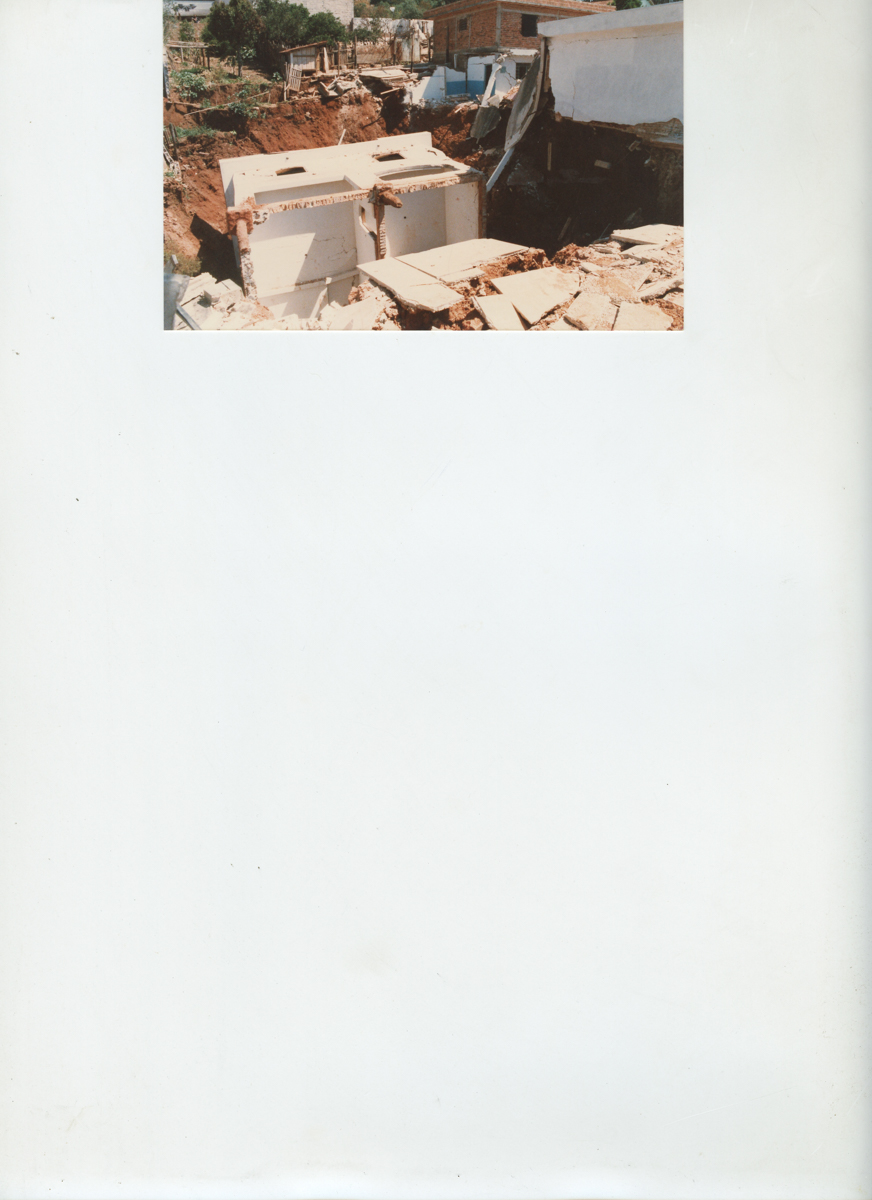 54 FOTOS - *Primeiro quadrante superior – 6 fotos - Foto 1 a 6 – 13x8cm. Coloridas. Fotos de um desmoronamento de casa. Verso das fotos indica: “Buraco de Cajamar – SP. 12/9/86”. *Segundo quadrante superior – 9 fotos - Fotos 7 a 15 – 13x8cm. Coloridas. Fotos do desmoronamento de estrutura civil. Vários ângulos do local. Verso das fotos indica: “Buraco de Cajamar – SP. 12/9/86”. - *Primeiro quadrante inferior – 8 foto Fotos 16 a 23 – 13x8cm. Coloridas. Além das imagens do desmoronamento da estrutura trás duas fotos da população retirando seus pertences. Verso das fotos indica: “Buraco de Cajamar – SP. 12/9/86”. - *Segundo quadrante inferior – 11 fotos Fotos 24 a 34 – 13x8cm. Coloridas. Além das imagens do desmoronamento da estrutura trás duas fotos da população retirando seus pertences. Verso das fotos indica: “Buraco de Cajamar – SP. 12/9/86”.